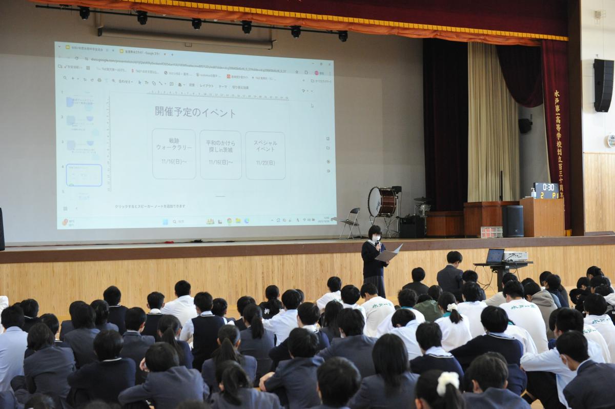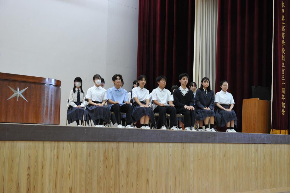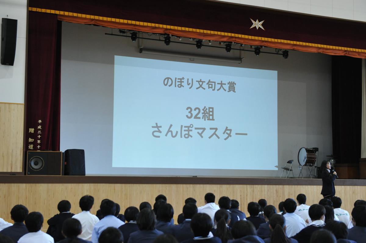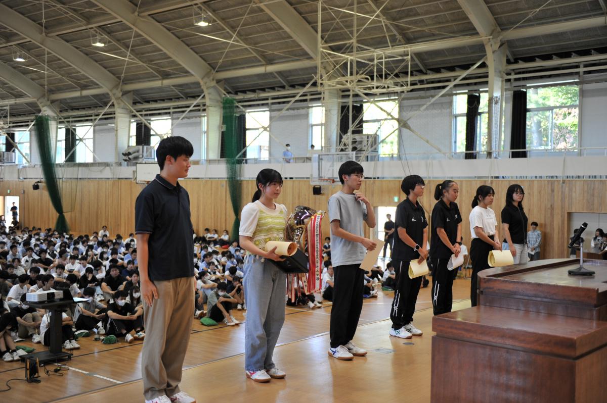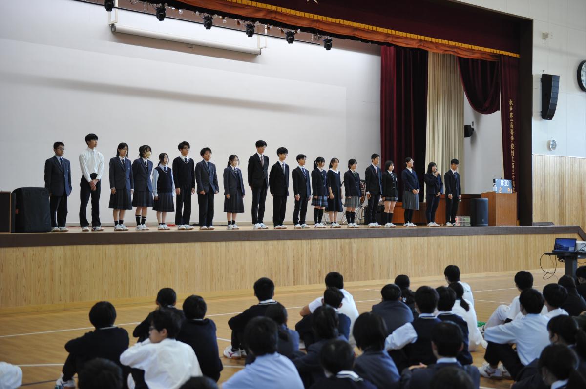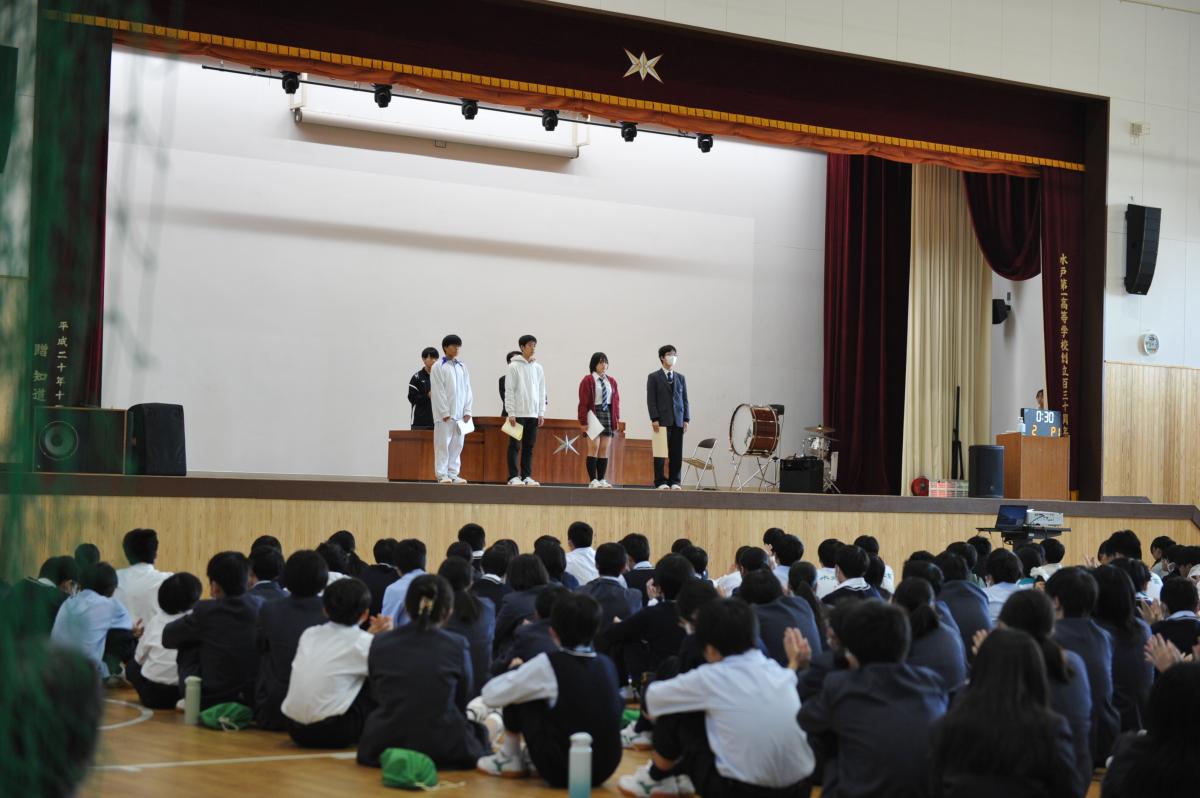 本日、後期最初の定例生徒集会を開催しました。校歌斉唱、校長講話、表彰(弓道部、英語研究会部、中学放送部)・壮行会(弓道部)、生徒会役員挨拶、のぼり文句大賞(「さんぽマスター」)の発表、中学生徒会報告、IBARAKIドリームパスの企画(中3戦跡ツアー)の紹介、自由討論(テーマ「後期生徒会に期待すること」)が行われました。