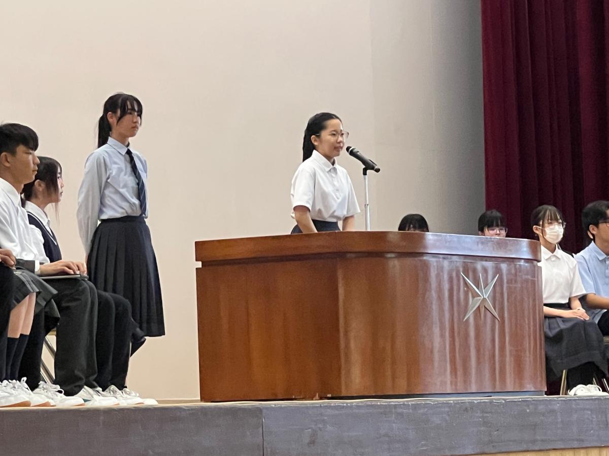 生徒集会では、校長講話、部(演劇、弓道、陸上競技、アマチュア無線)及び個人(ホームプロジェクト、ピアノ)への表彰、壮行会(陸上競技)、委員会からの連絡(学苑祭、歩く会、図書、生徒会本部)が行われました。