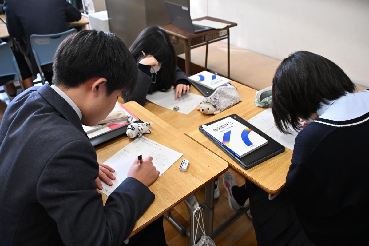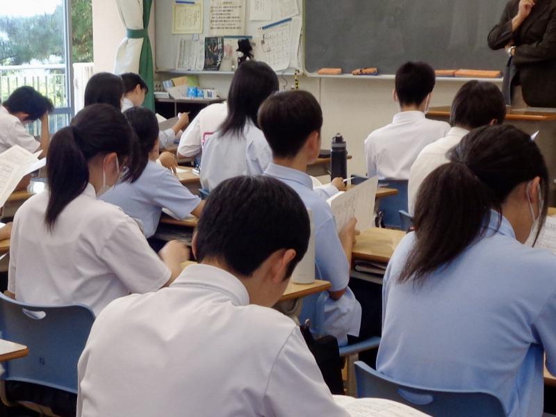 実力テストに臨みました。日頃実施している単元テストとは異なり、広い試験範囲で、難度の高い問題も含んでいるテストです。自分自身の課題の発見や高い思考力の育成、高校との接続の意識を高めることなどを目的に、教職員で作成しています。どのクラスも真剣に問題に向き合う姿が印象的でした。