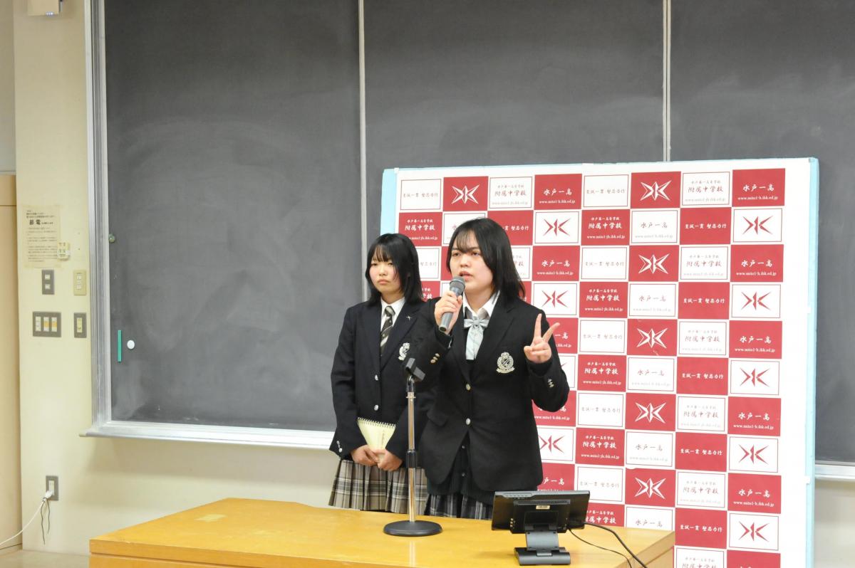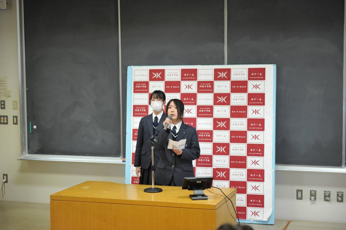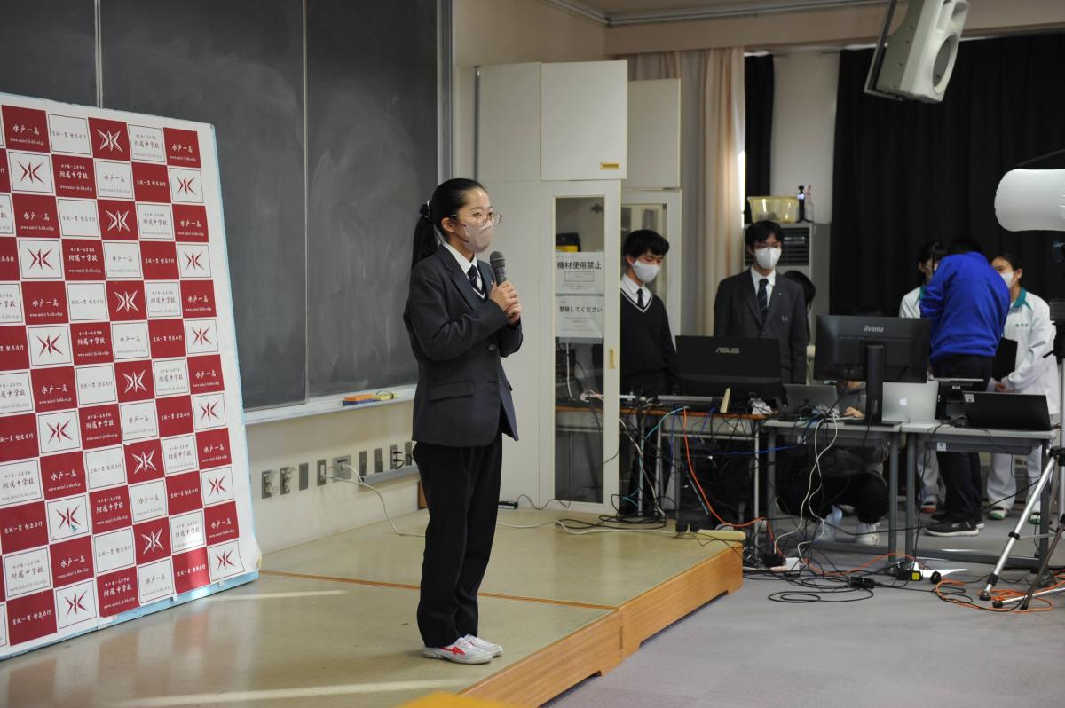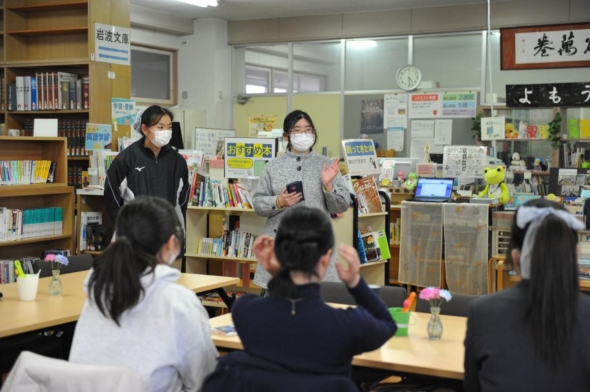 また、昨年度、同事業の「戦略チーム」に選ばれて活躍した生徒を中心とするグループ「ゴーライブラリー」のメンバー(高1)が、附属中学生に対し、給食の時間に同事業のPRを行いました。先輩の高校生が教室に来て話をしてくれることは中学生にとって新鮮だったようで、中高交流のバリエーションが増えました。