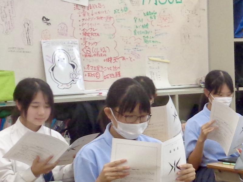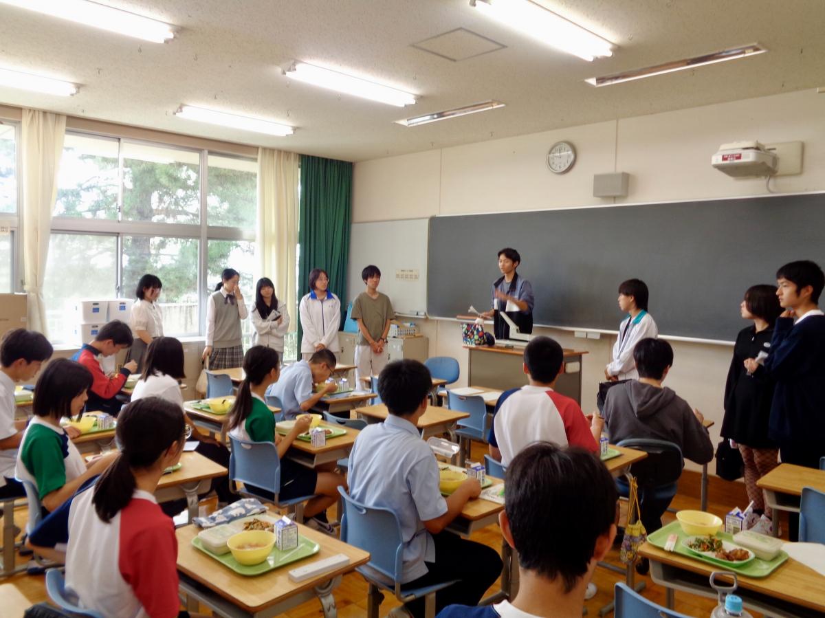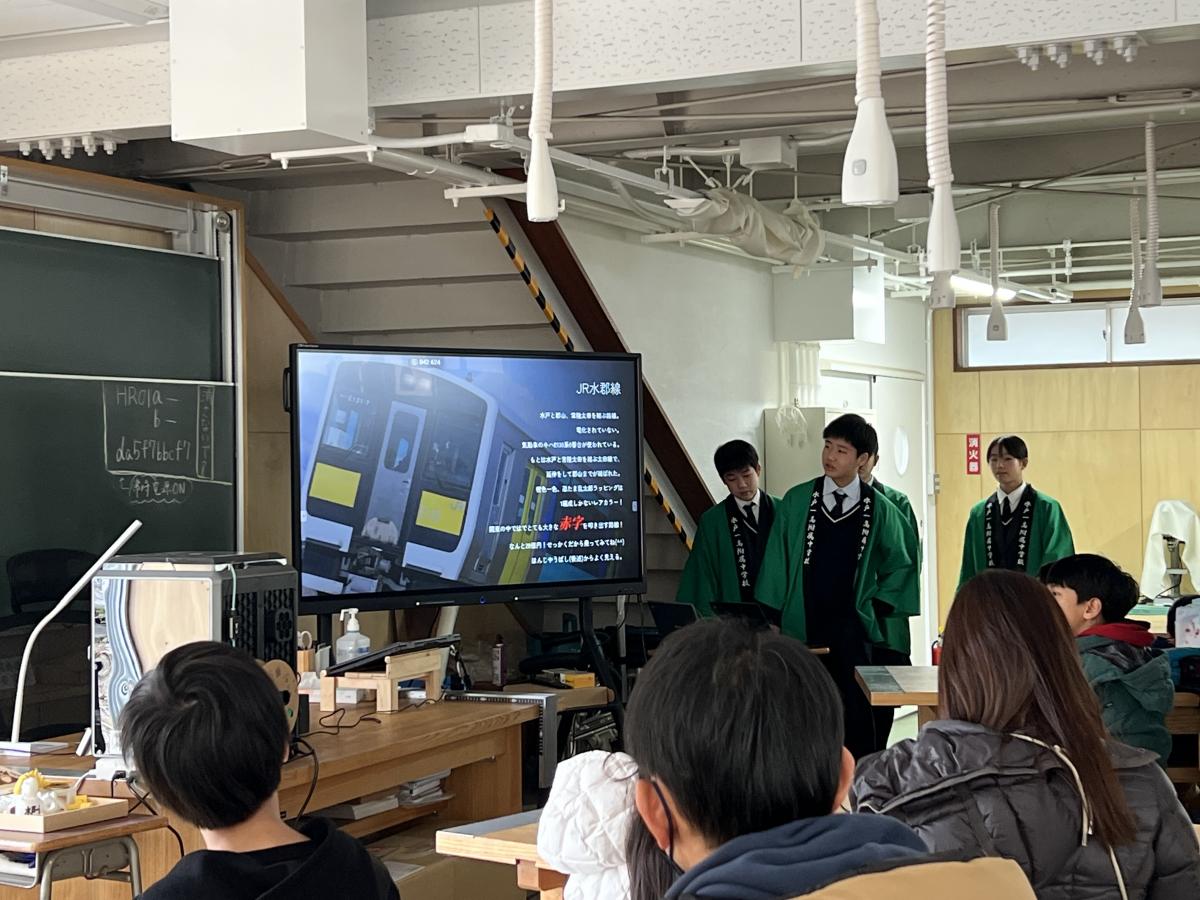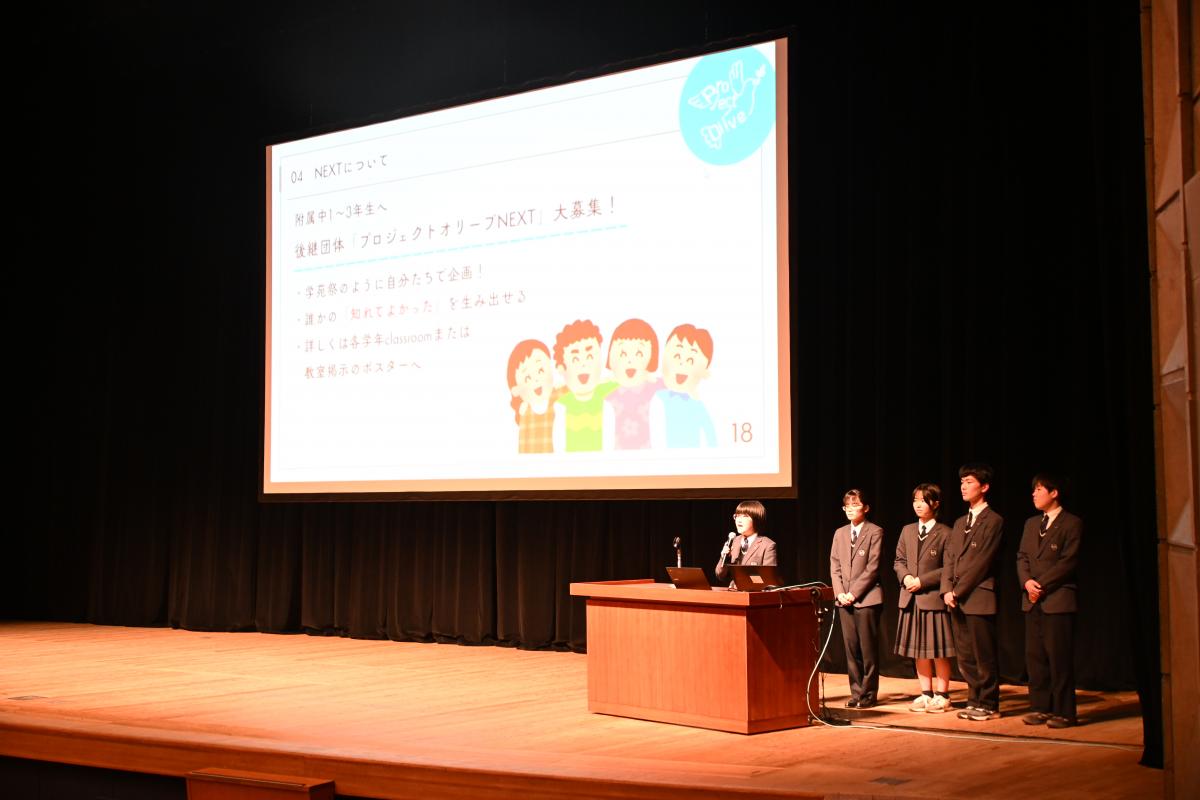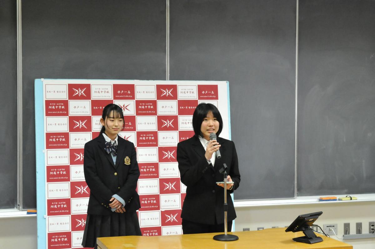 また、昨年度、同事業の「戦略チーム」に選ばれて活躍した生徒を中心とするグループ「ゴーライブラリー」のメンバー(高1)が、附属中学生に対し、給食の時間に同事業のPRを行いました。先輩の高校生が教室に来て話をしてくれることは中学生にとって新鮮だったようで、中高交流のバリエーションが増えました。