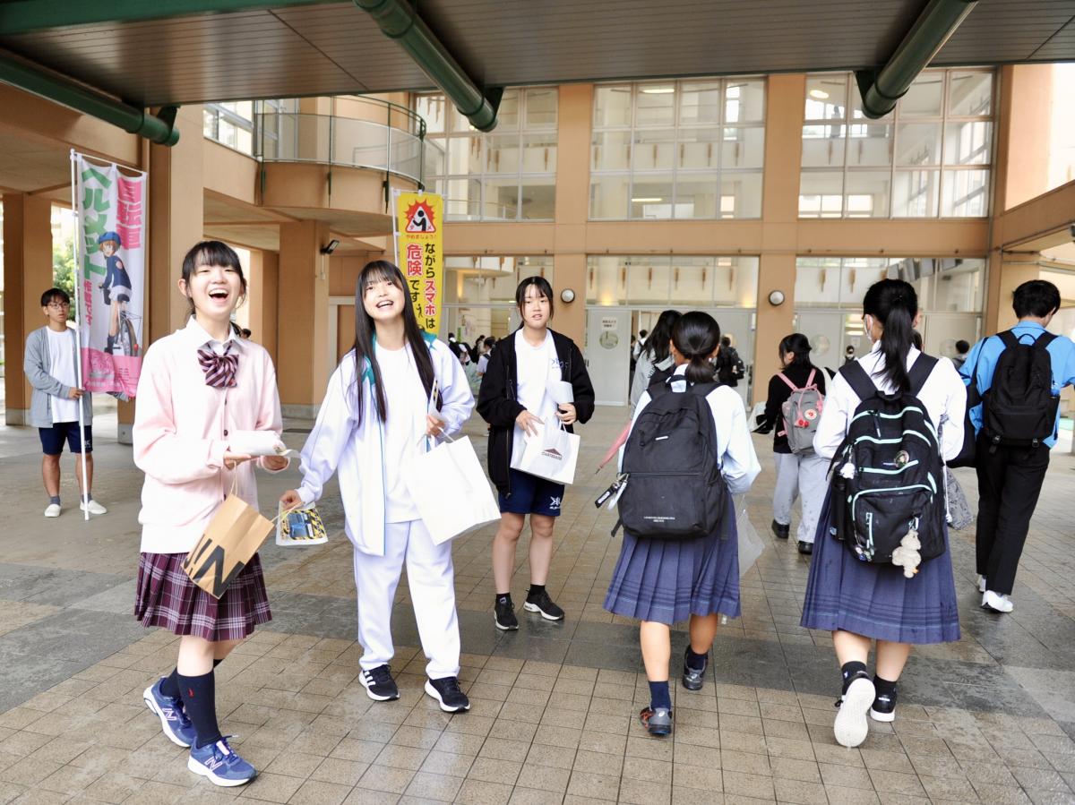後期初日の朝。小雨が舞う涼しい天気のなか、高校のマナーアップ委員が、登校してくる生徒たちと元気に挨拶を交わしつつ、ヘルメット着用や「ながらスマホ」の禁止などを呼びかけていました。