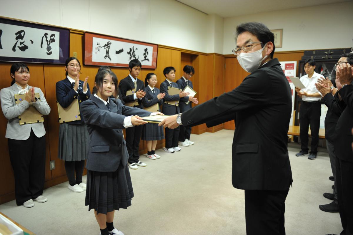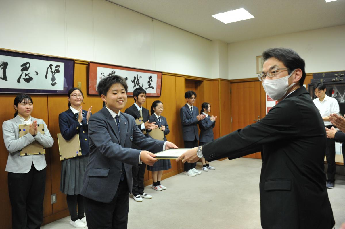 校長より認証書が手渡された後、生徒会長と3名の副会長が抱負を述べました。続いて、校長、副校長、教頭及び特別活動部長から激励の言葉が送られました。新体制が、本校に新たな風を吹き込んでくれることを期待します。