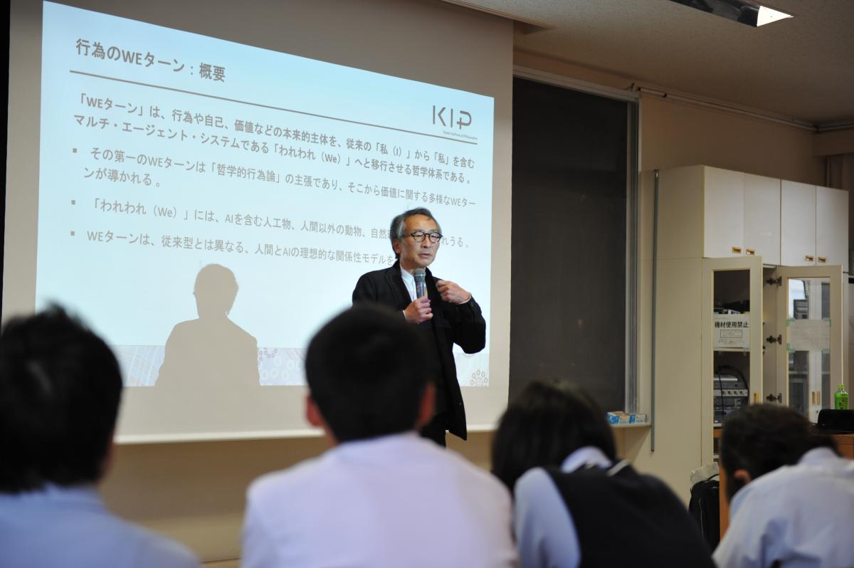 まず、大学院人間・環境学研究科の大教室にて、石村豊穂教授から講義を受けました。異分野が出会って新たな視点につながることや、違った視点でものを見ることの大切さ等について、具体例を豊富に交えつつ、わかりやすく教えていただきました。
