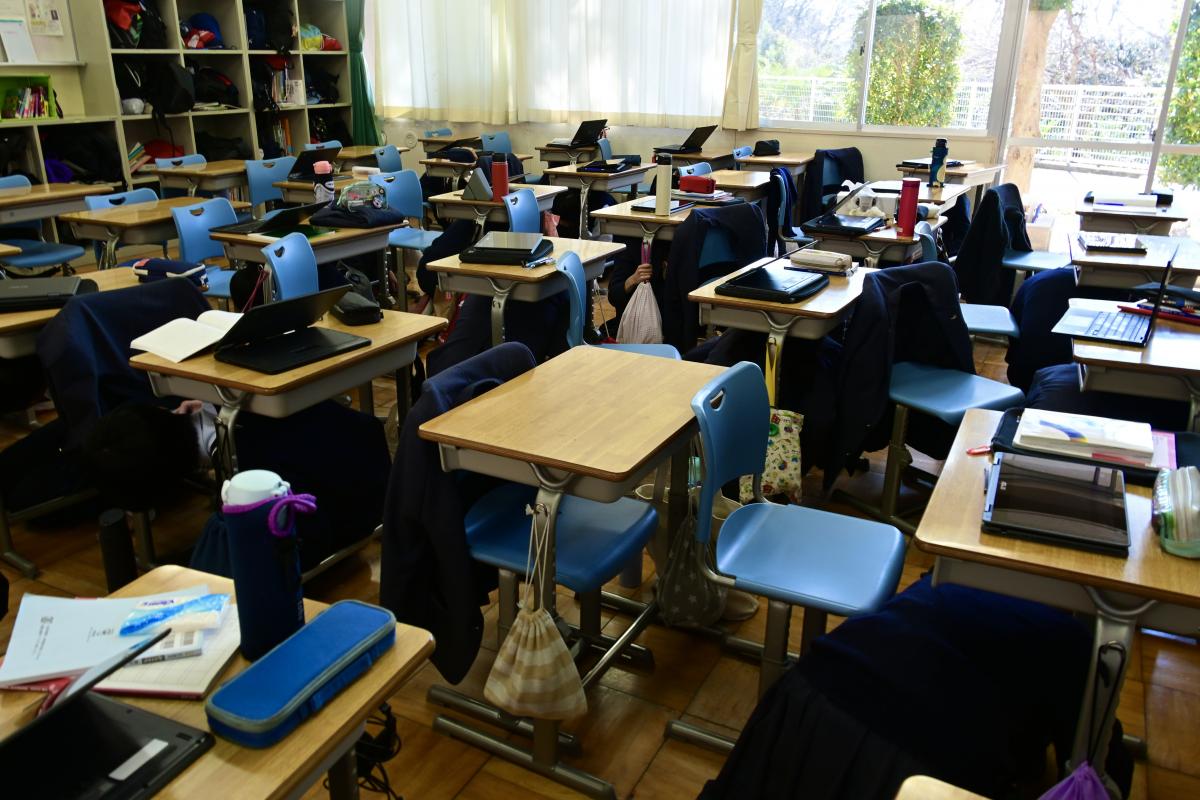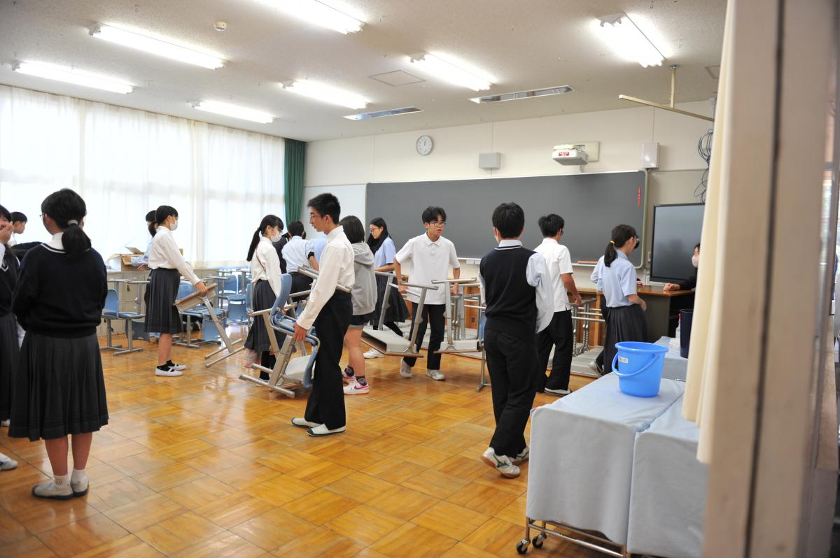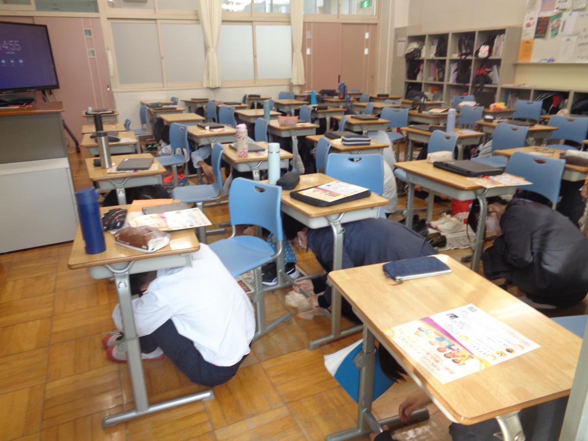 校内への不審者侵入を想定した避難訓練を、全校一斉に実施しました。生徒たちは、教室のドアを施錠し、かつバリケードを築くなど、速やかに安全確保の行動をとりました。