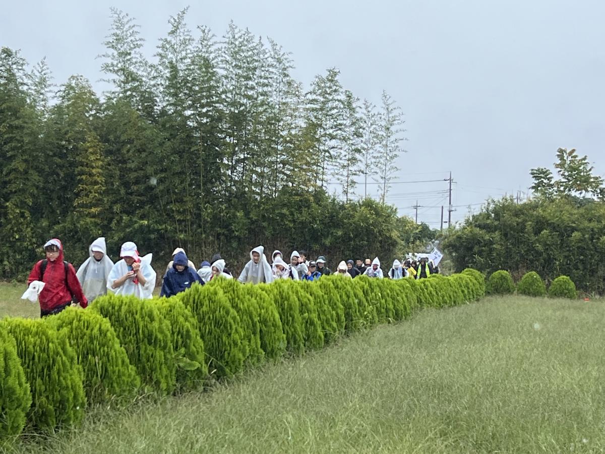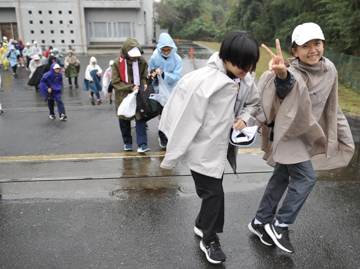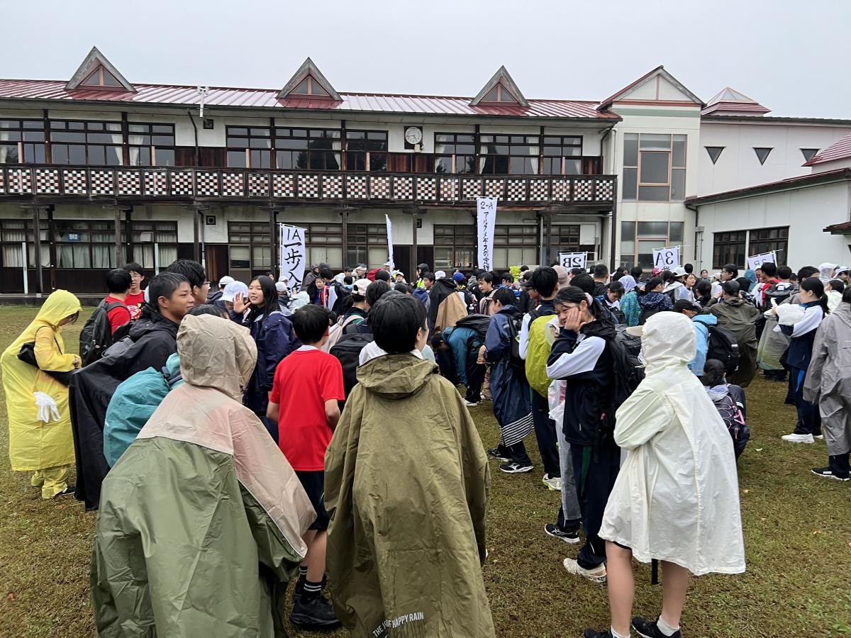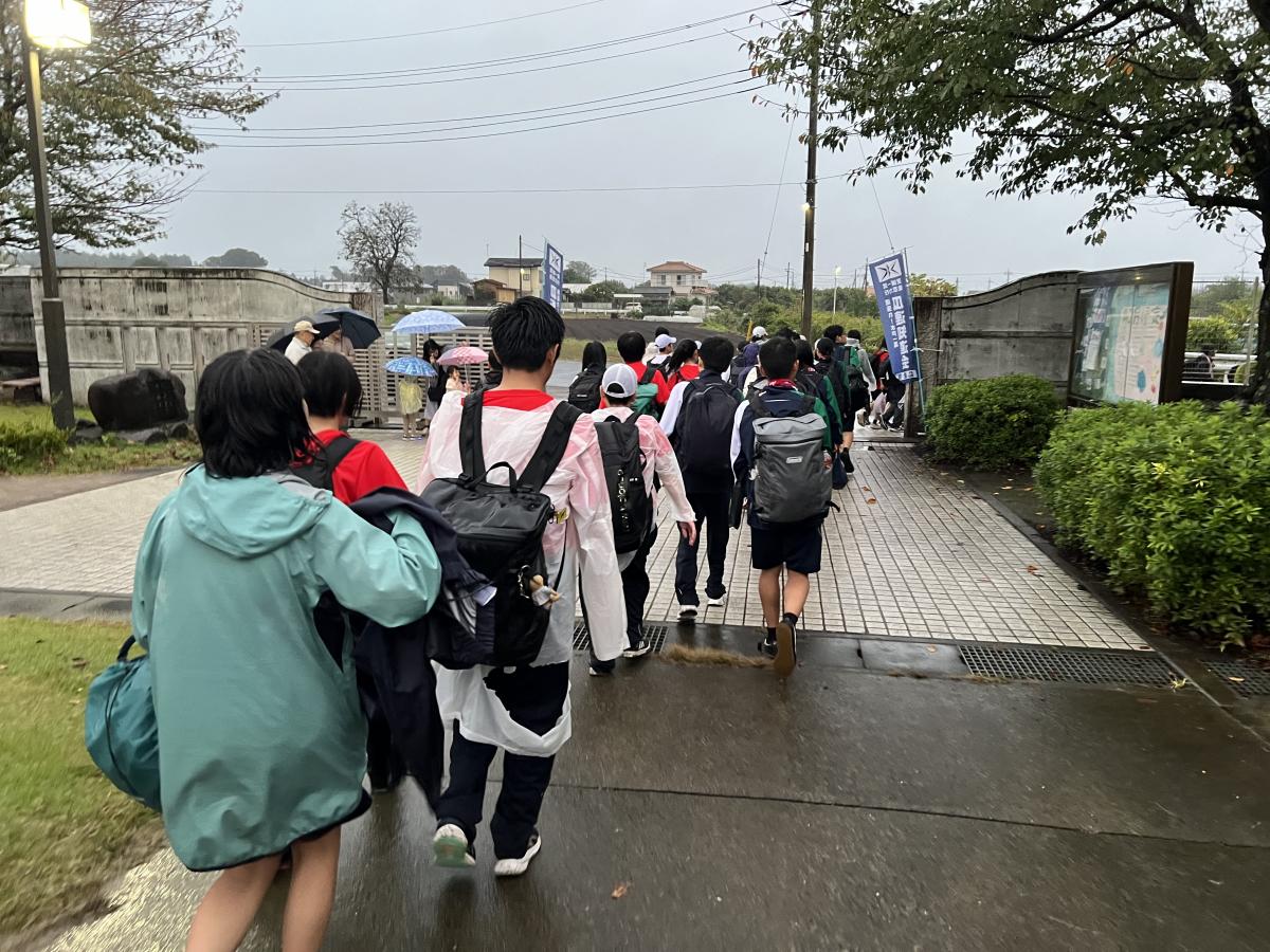 本日は、第77回歩く会の団体歩行を実施しました。常陸大宮市立山方中学校を出発し、中学生は中休止地(那珂市立瓜連小学校)まで歩くコースです。雨の中、約23kmの道のりを完歩した生徒たちは、清々しい表情で帰りのバスに乗り込んでいきました。