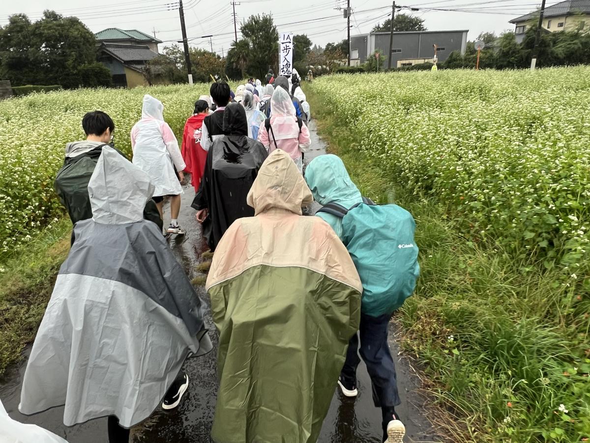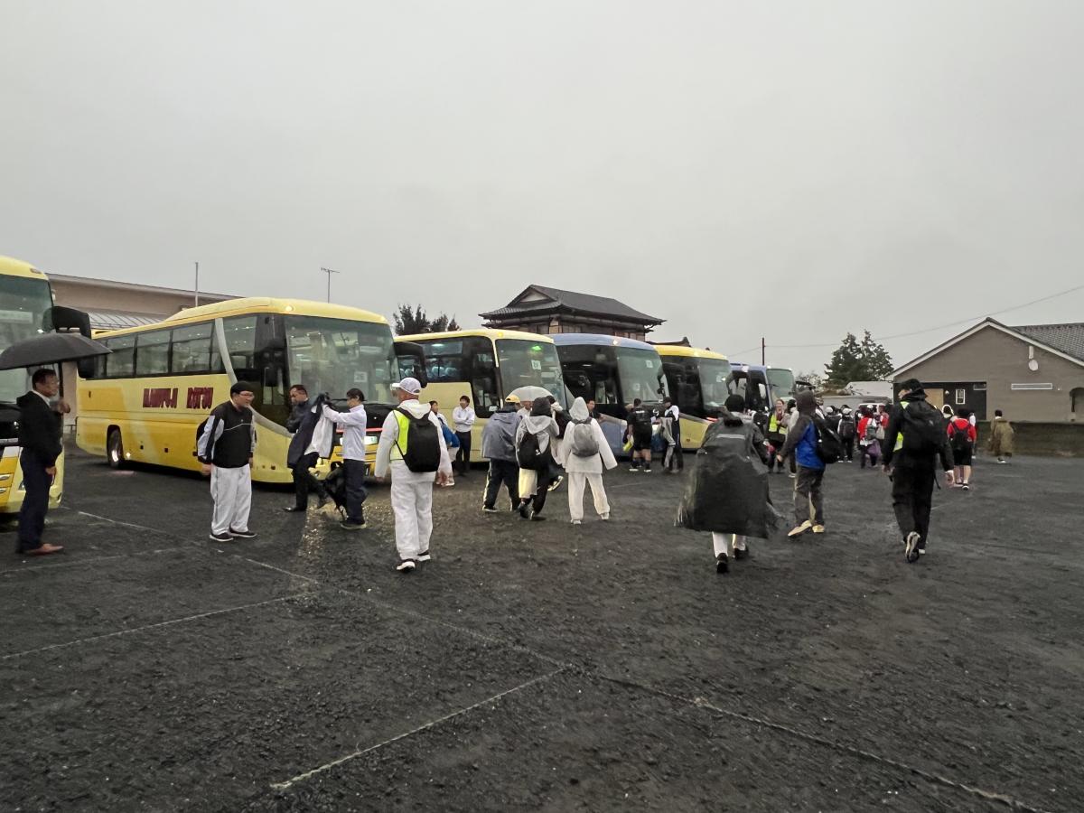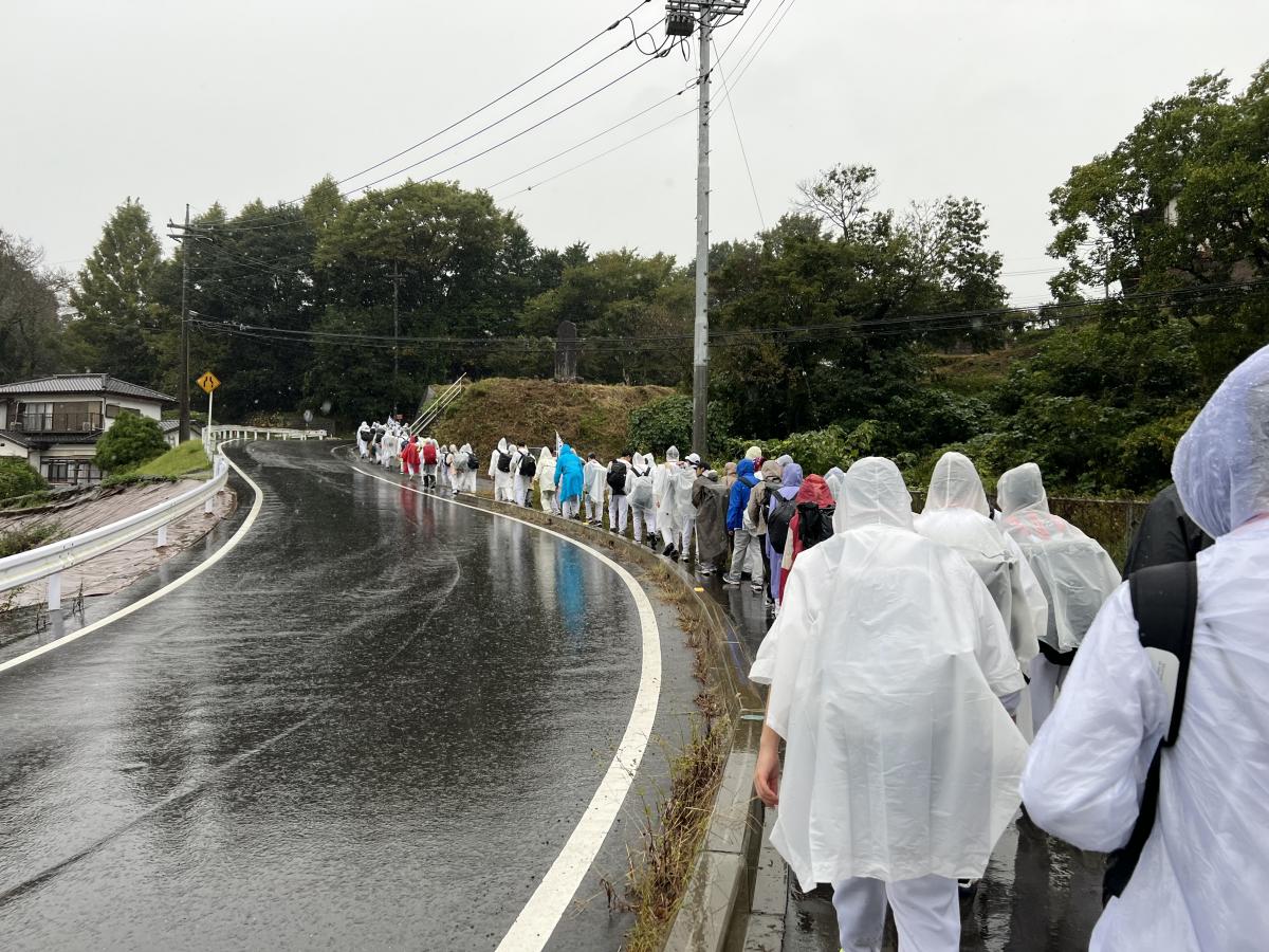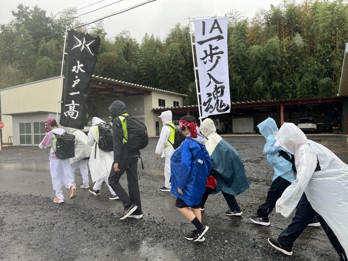 本日は、第77回歩く会の団体歩行を実施しました。常陸大宮市立山方中学校を出発し、中学生は中休止地(那珂市立瓜連小学校)まで歩くコースです。雨の中、約23kmの道のりを完歩した生徒たちは、清々しい表情で帰りのバスに乗り込んでいきました。