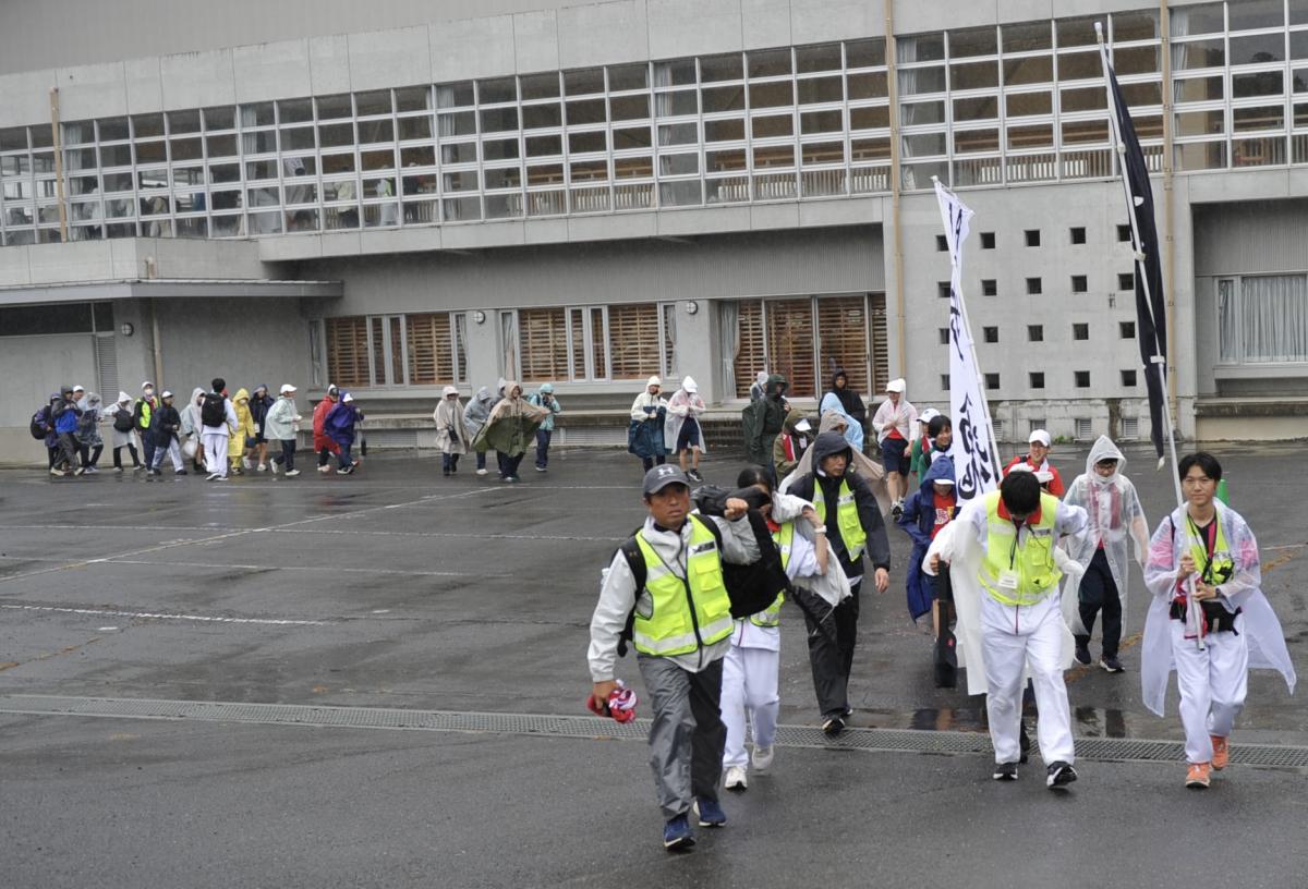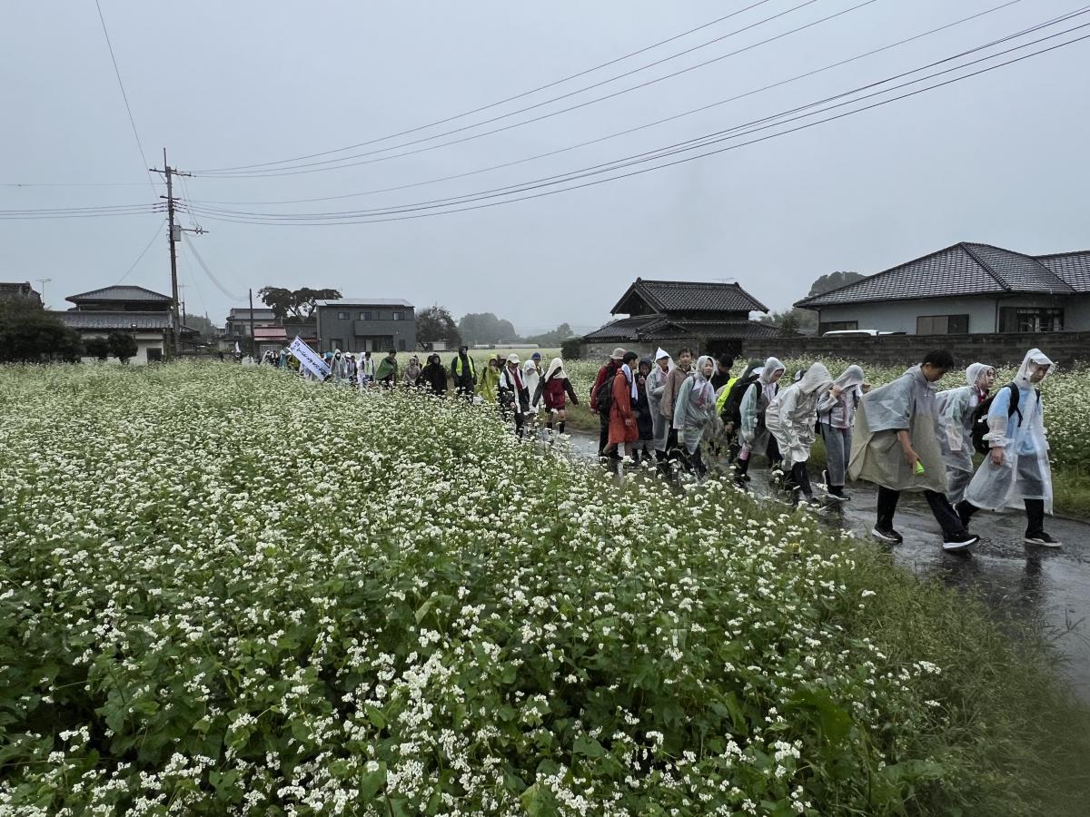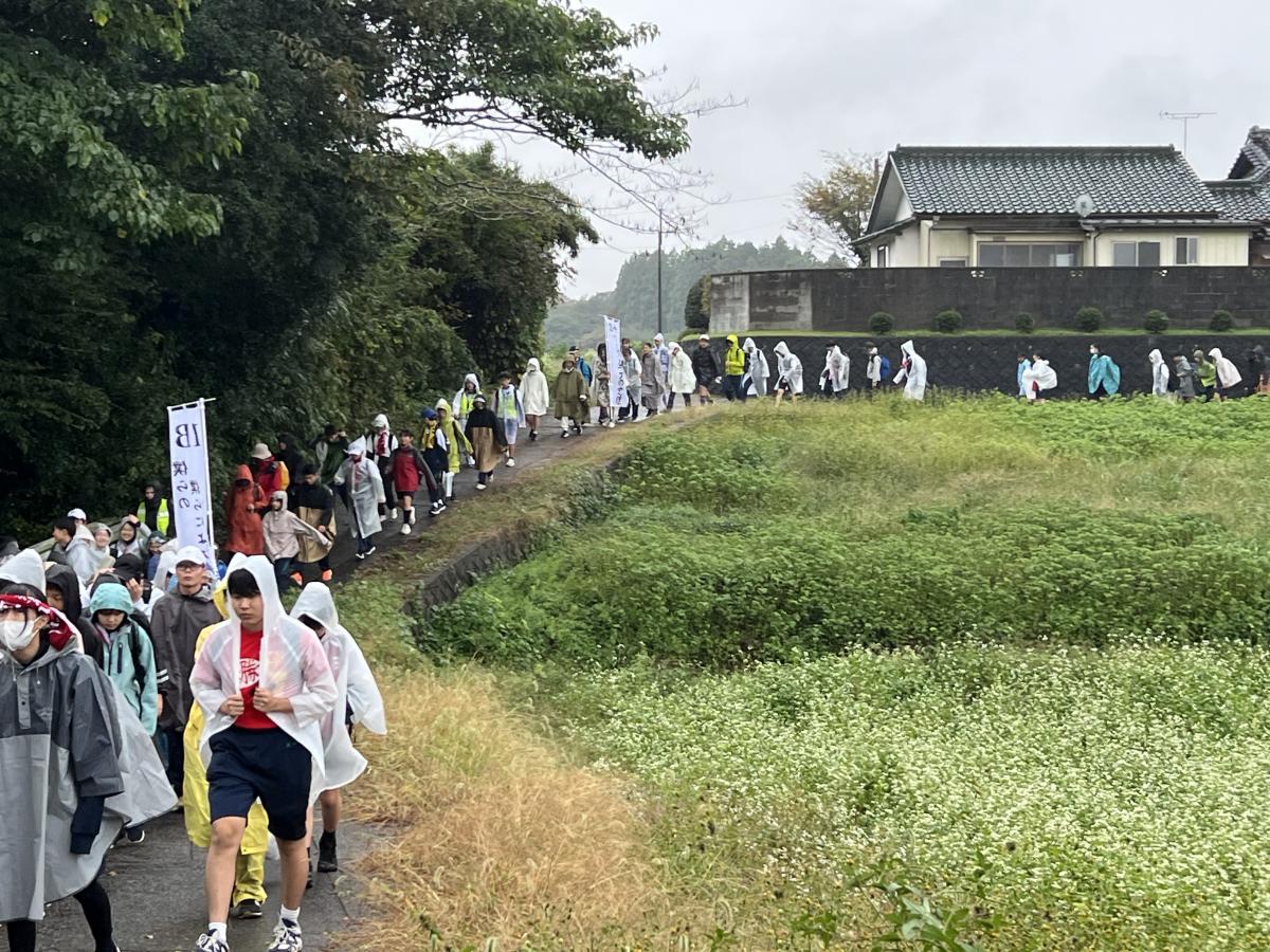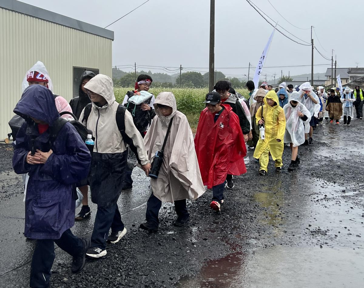 本日は、第77回歩く会の団体歩行を実施しました。常陸大宮市立山方中学校を出発し、中学生は中休止地(那珂市立瓜連小学校)まで歩くコースです。雨の中、約23kmの道のりを完歩した生徒たちは、清々しい表情で帰りのバスに乗り込んでいきました。
