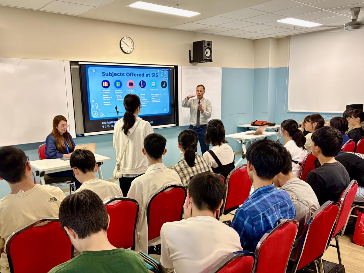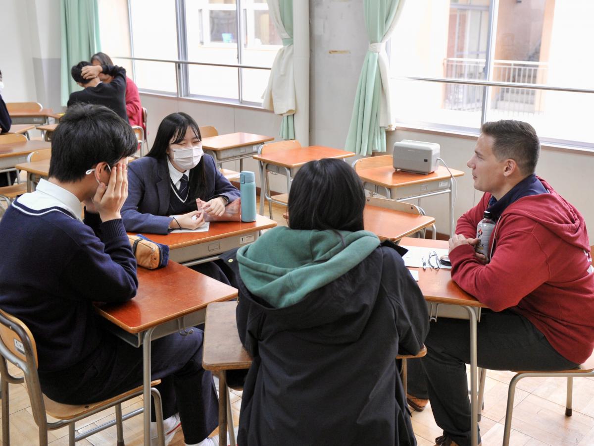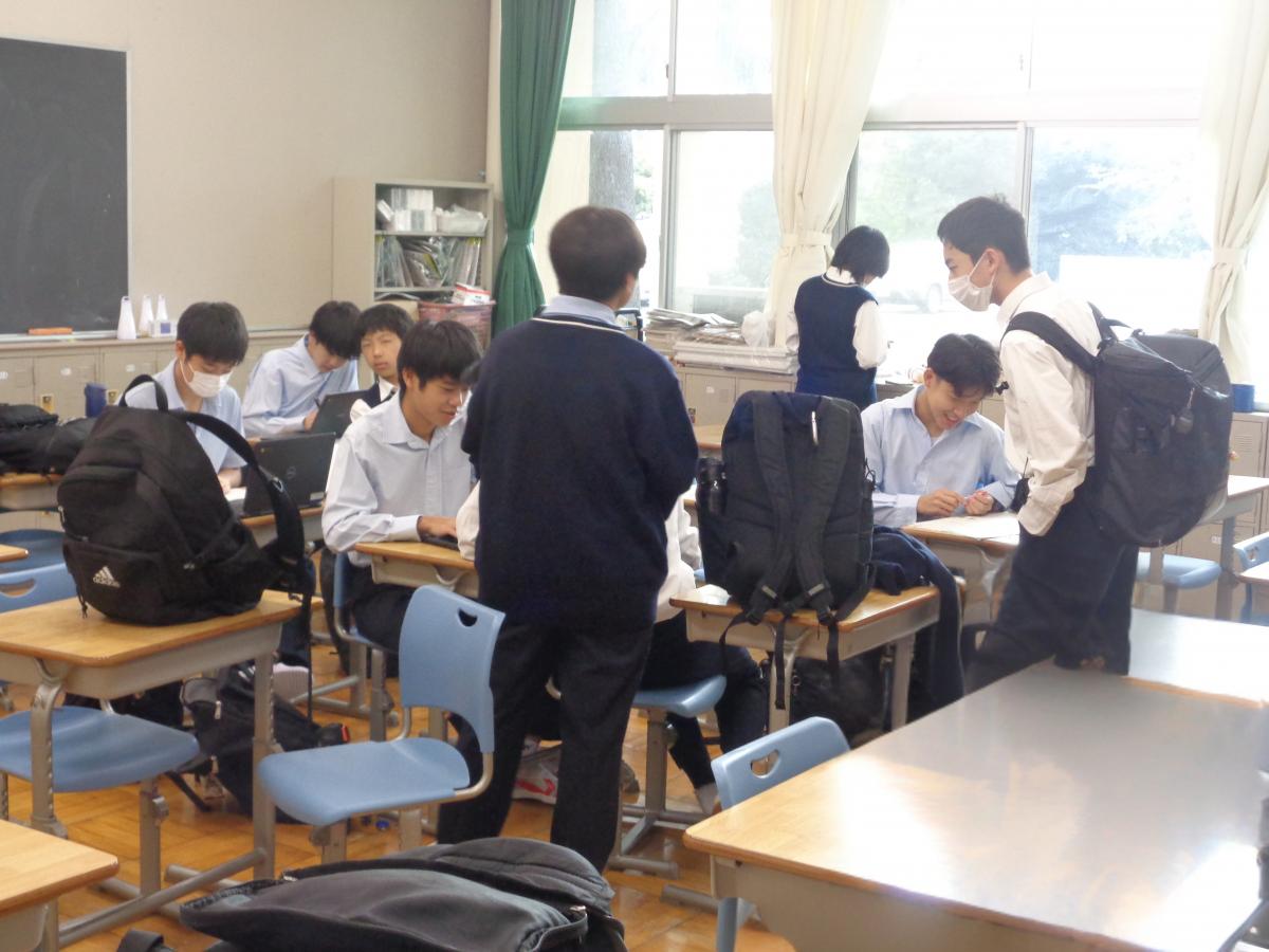 今年度末に米国、台湾に派遣される生徒(中3・高1)たちが、昼休みに英語ネイティブの先生・A LTと英会話を行っています。英語でのコミュニケーション力を高め、現地での講義や現地学生との交流などに備えます。