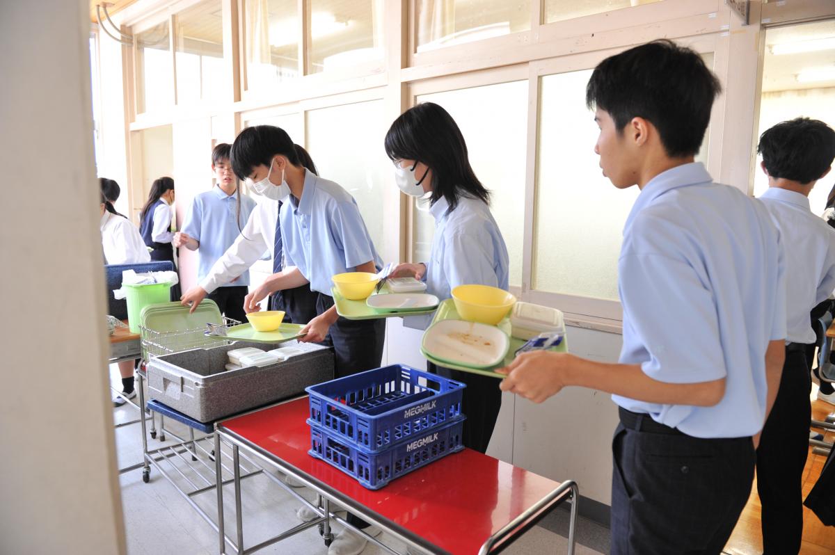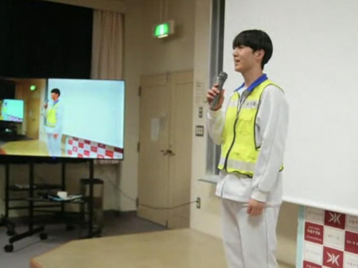 保健主事からの危機管理指導と避難経路確認、校長先生からの講評のあと、賞味期限が近い防災備蓄品を生徒に配布し、避難訓練を終えました。これからも、防災・防犯のための訓練を定期的に実施するなどして、生徒・職員の危機管理能力を高めてまいります。