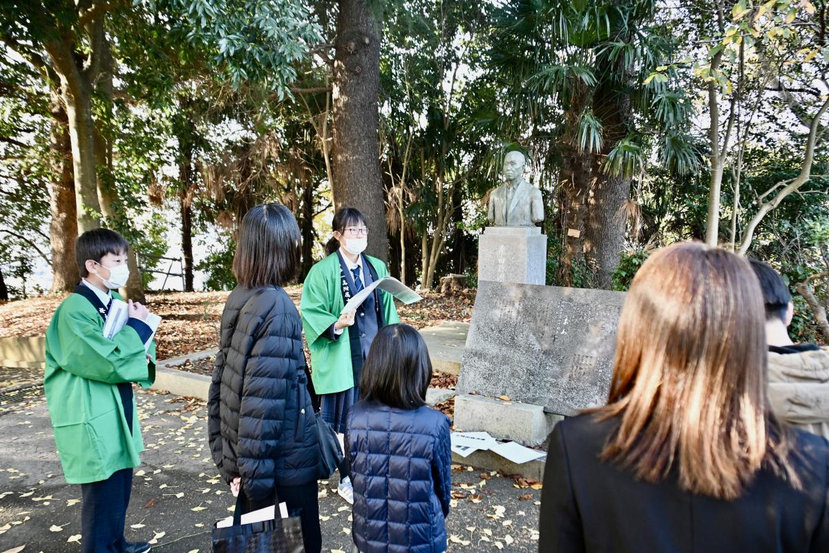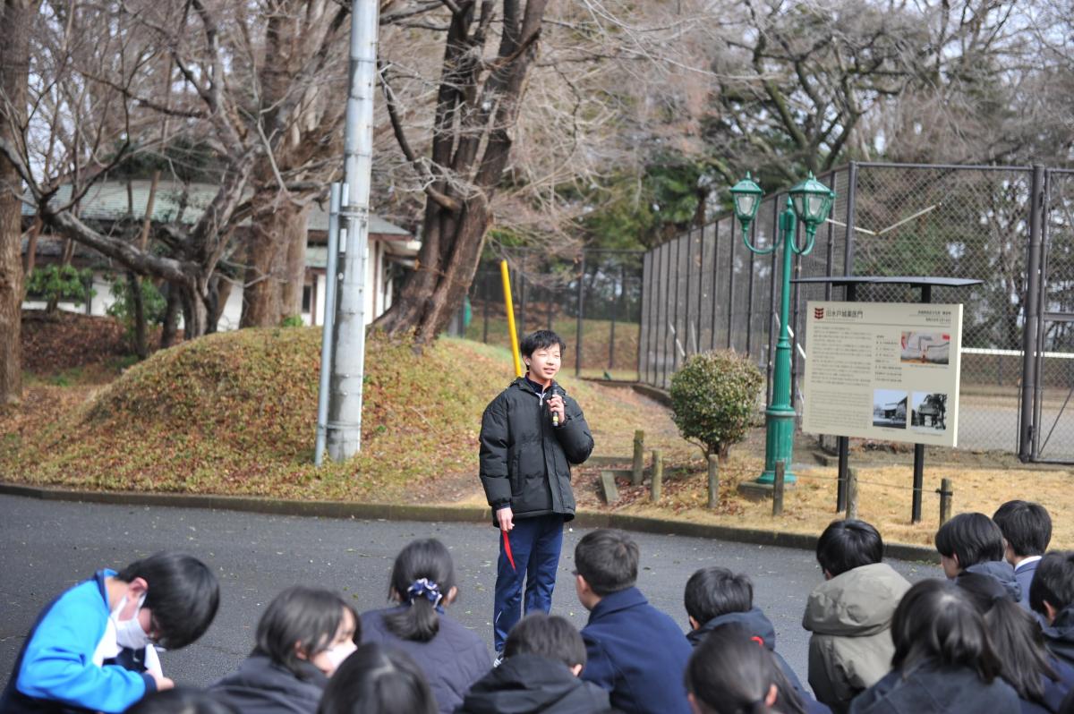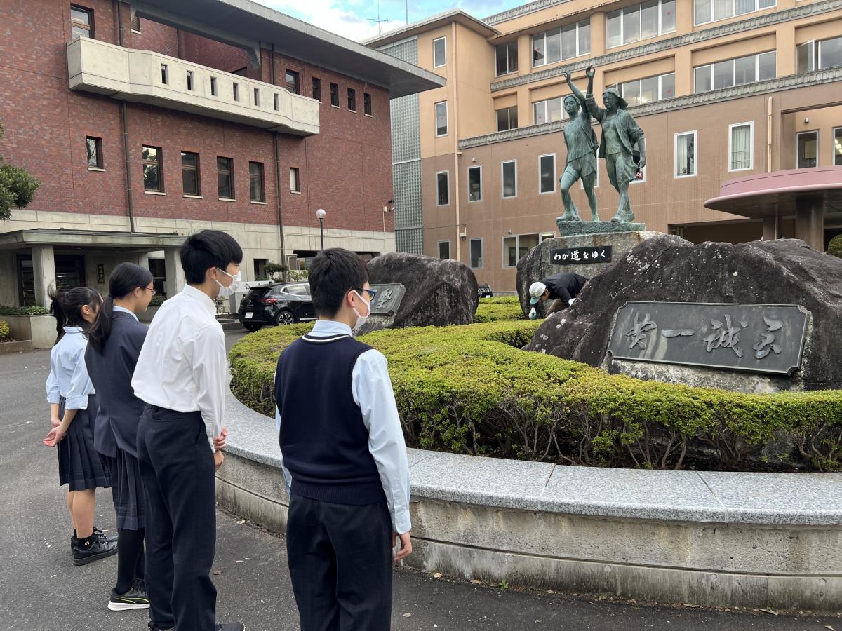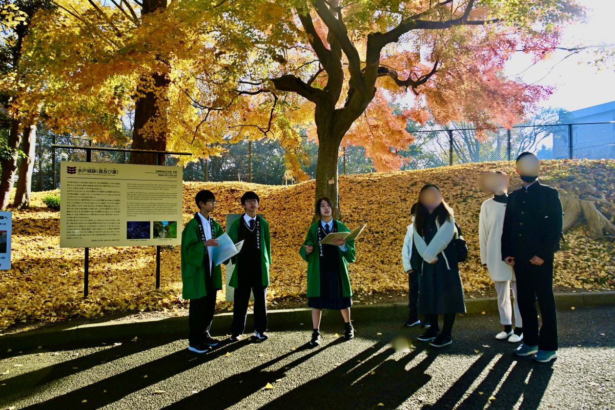 総合の時間に、校内ガイドツアー「水戸一の道」を通じ、中1と中2の交流を行いました。中2の先輩1人が中1の後輩2人を案内しながら、校内名所をめぐりました。虎口、薬医門、ロータリー、隅櫓跡、江山閣、武石浩玻像、飛田穂洲・石井連蔵像、メタセコイアなど、それぞれのスポットで、中2の先輩がクイズや発見した昔の瓦など現物史料も交えながら、詳しく解説を行いました。先輩たちの話を熱心に聞いていた中1生は、今回の経験を活かしつつ、自分たちのバージョンの「水戸一の道」ガイドツアーを企画していきます。