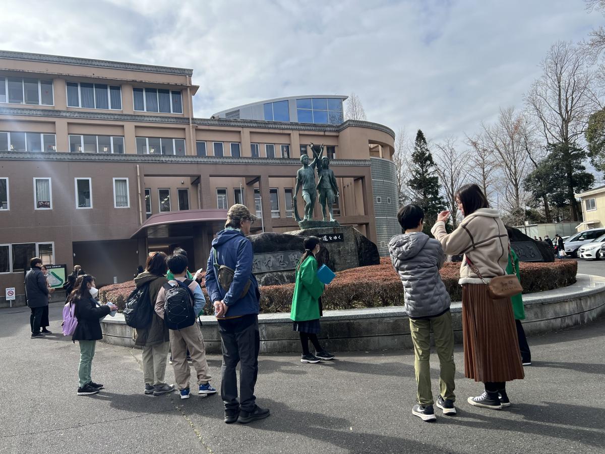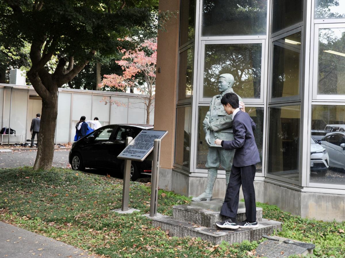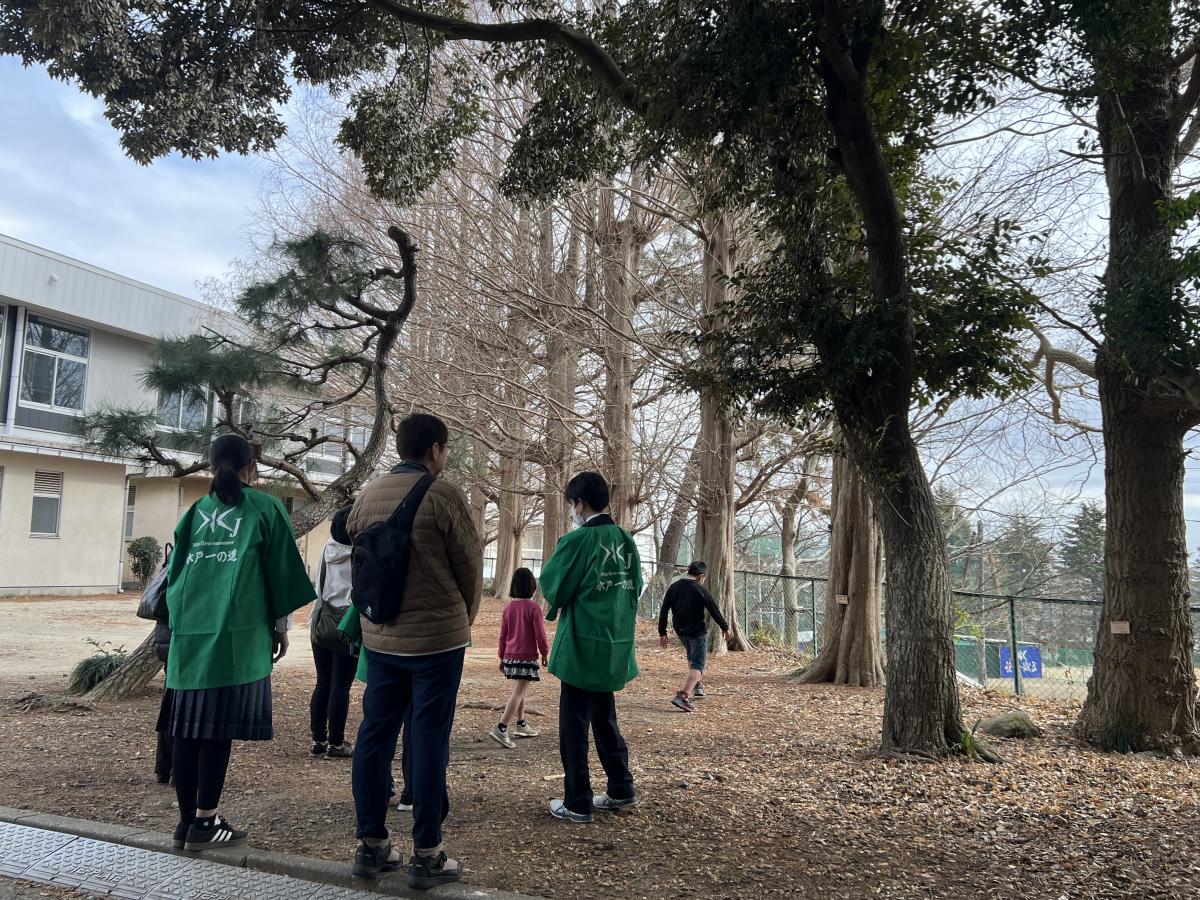 総合の時間に、校内ガイドツアー「水戸一の道」を通じ、中1と中2の交流を行いました。中2の先輩1人が中1の後輩2人を案内しながら、校内名所をめぐりました。虎口、薬医門、ロータリー、隅櫓跡、江山閣、武石浩玻像、飛田穂洲・石井連蔵像、メタセコイアなど、それぞれのスポットで、中2の先輩がクイズや発見した昔の瓦など現物史料も交えながら、詳しく解説を行いました。先輩たちの話を熱心に聞いていた中1生は、今回の経験を活かしつつ、自分たちのバージョンの「水戸一の道」ガイドツアーを企画していきます。
