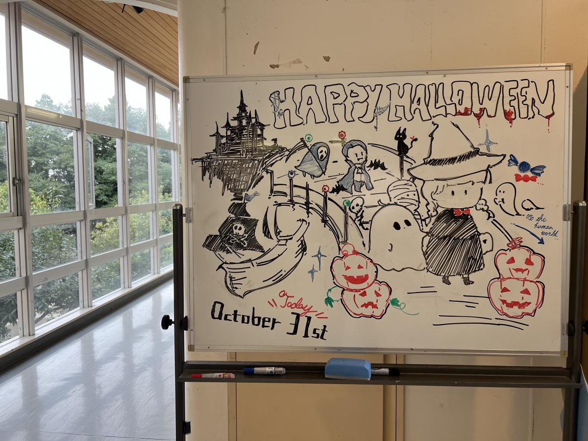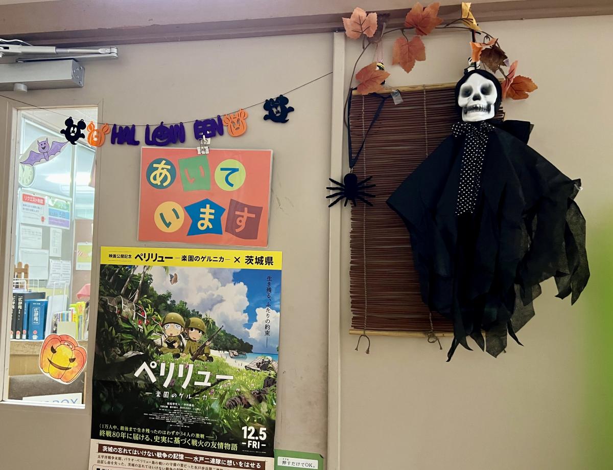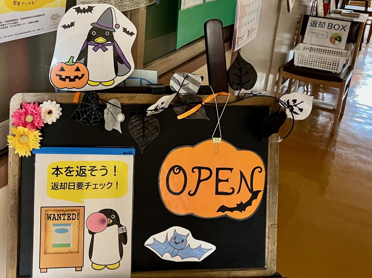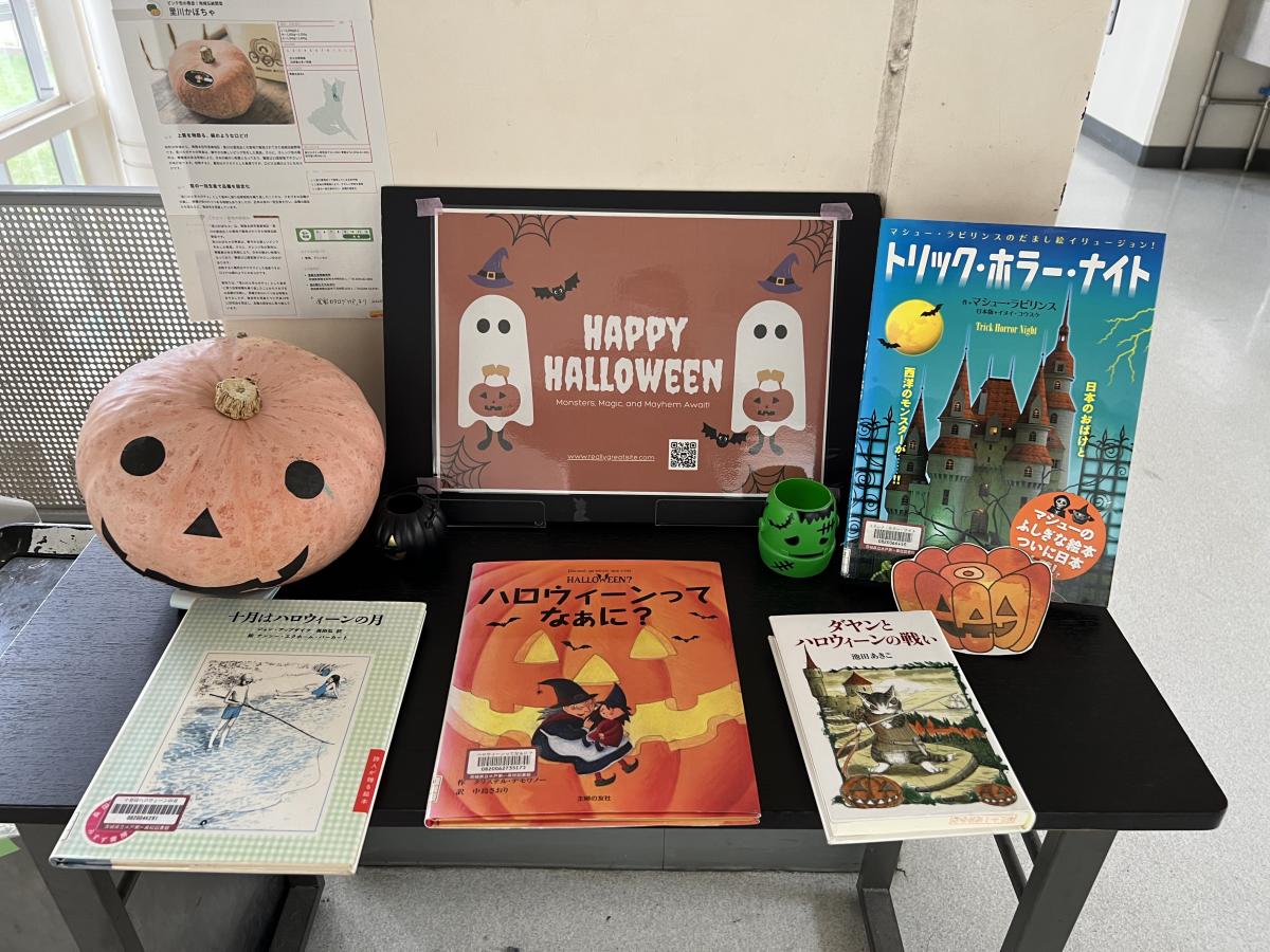 今日はハロウィーン。飾りつけや関係図書の企画展示など、校内は楽しい雰囲気に包まれていました。
