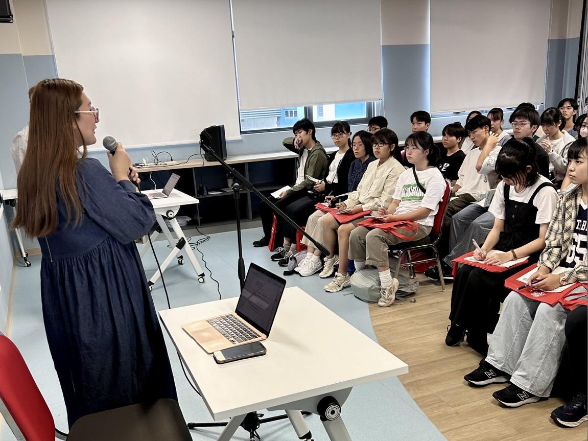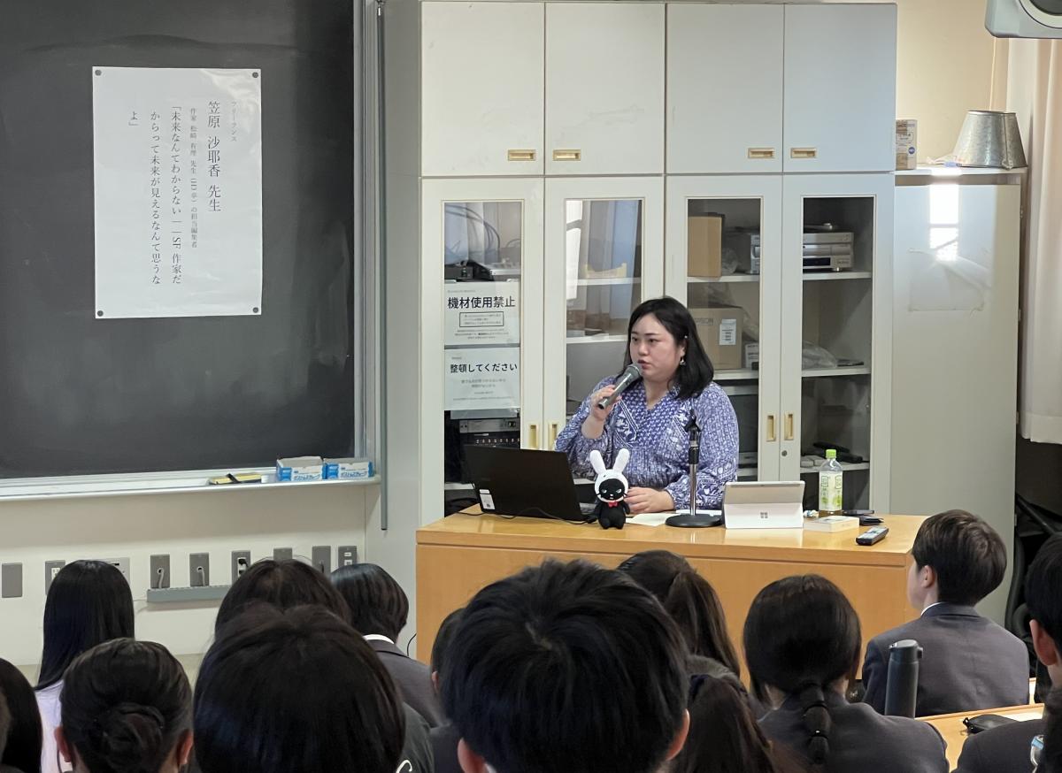 数多くの著作のある文芸評論家の三宅香帆さんをお招きし、中1を対象に、探究講話を開催しました。中学時代から本校出身の作家・恩田陸さんの作品を愛読され、書評も手がけてこられた三宅さん。恩田さんの魅力を、①ジャンルの広さ、②時代を超えた物語、③エッセイの魅力の3点に整理し、詳しく紹介していただきました。ご講演終了後も含め、生徒たちは多くの質問をさせていただきましたが、一つひとつ丁寧に答えてくださいました。