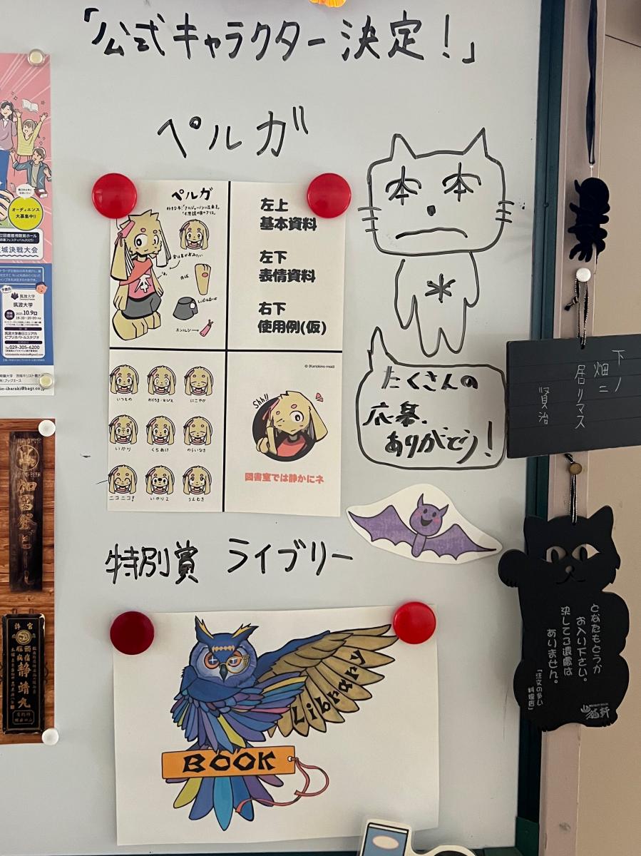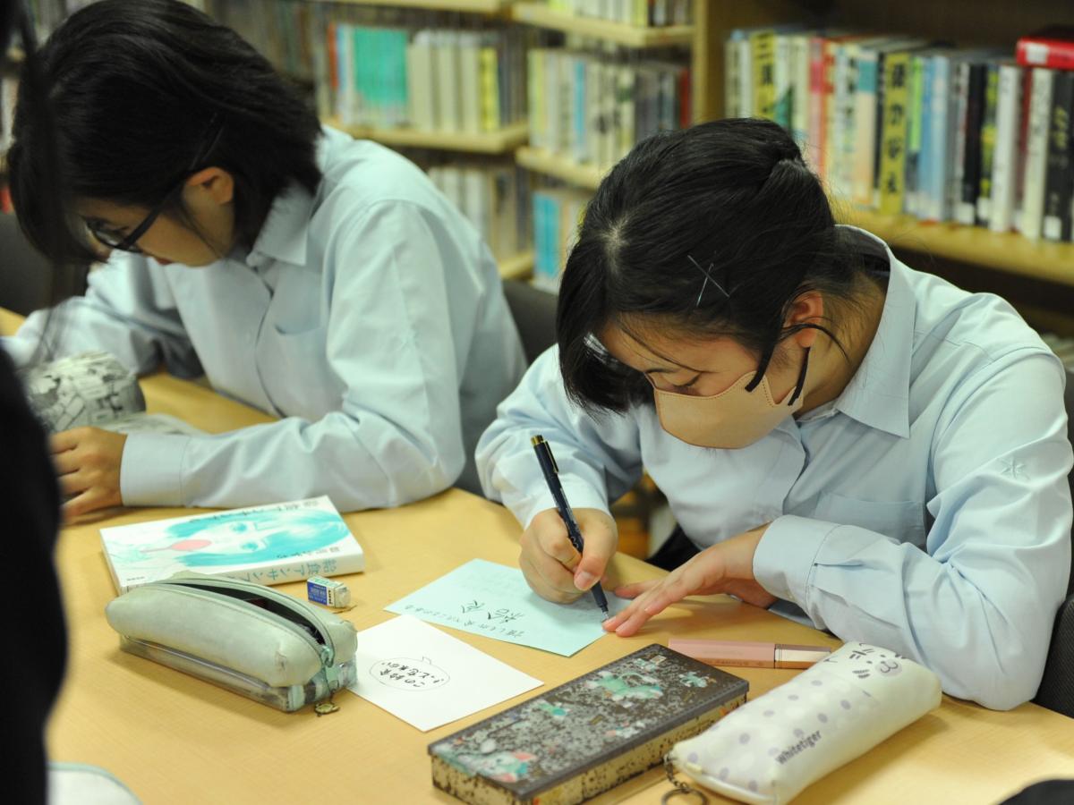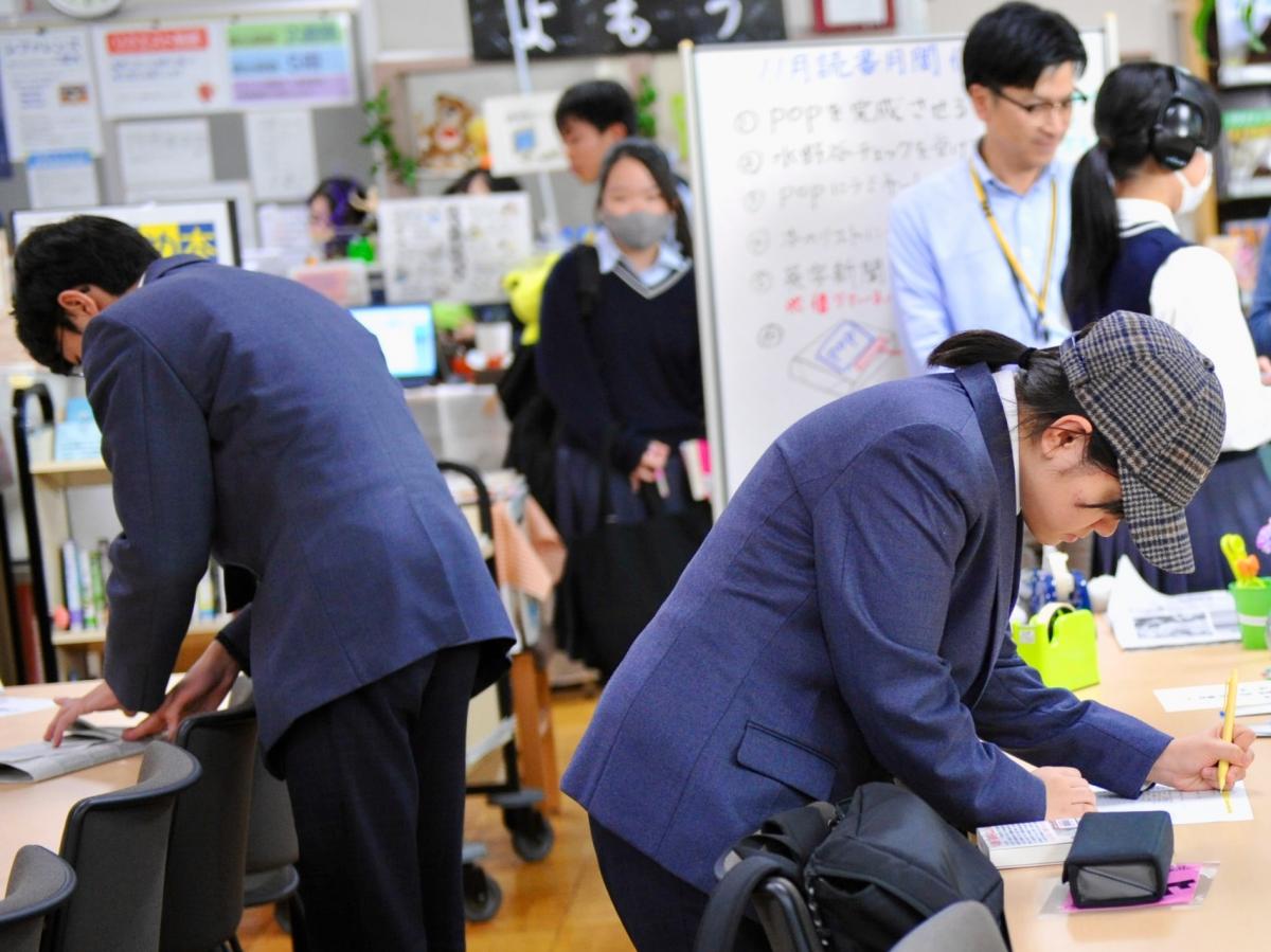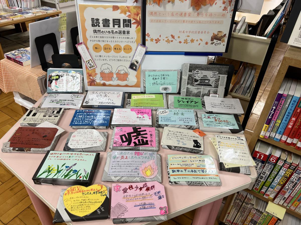 文化の日を挟んだ2週間は、読書週間です。読書の秋、本校の図書館では、図書館の公式キャラクターを募集したり、本をラッピングしたり、POPやしおりを作ったりするなどして、読書活動を促進しています。