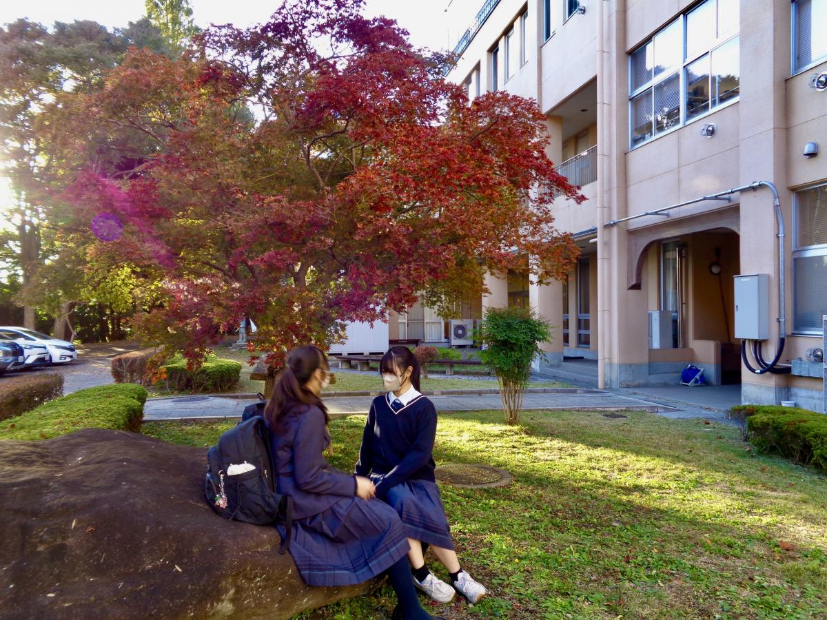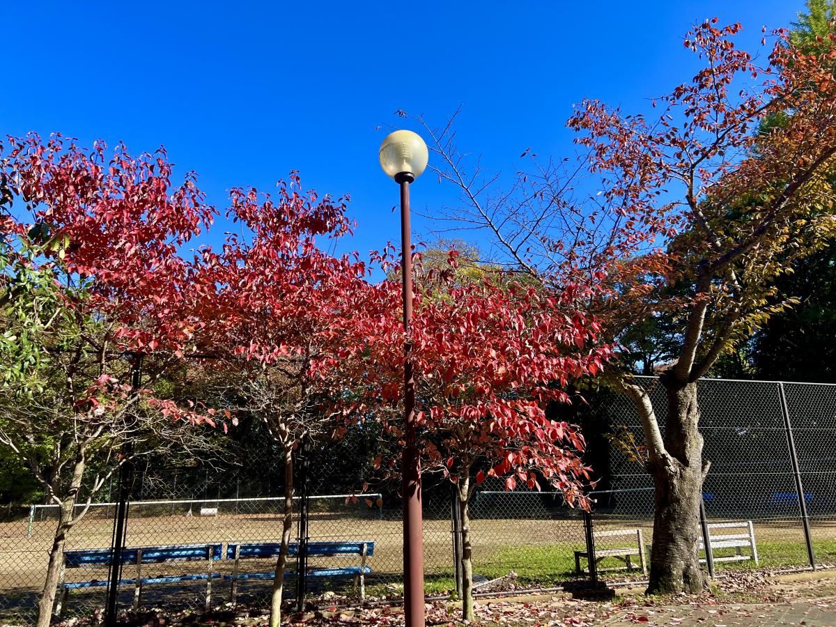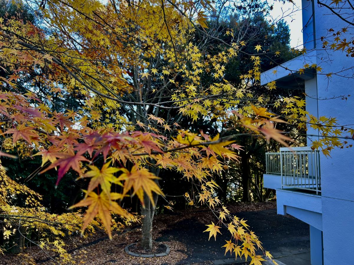 体育館裏の日当たりの悪い場所にあるモミジは葉を長く保ち、遅れていま色鮮やかに。