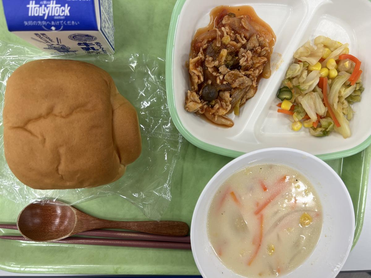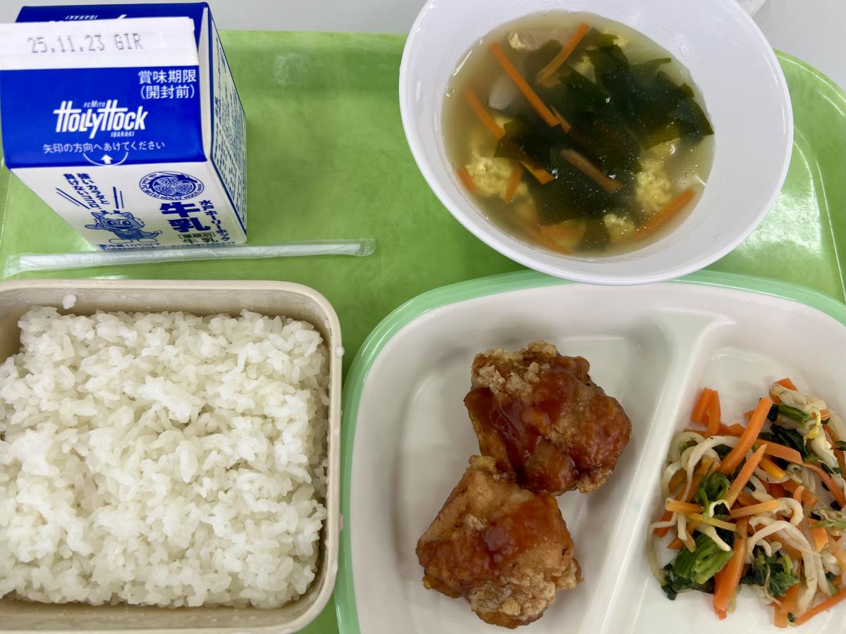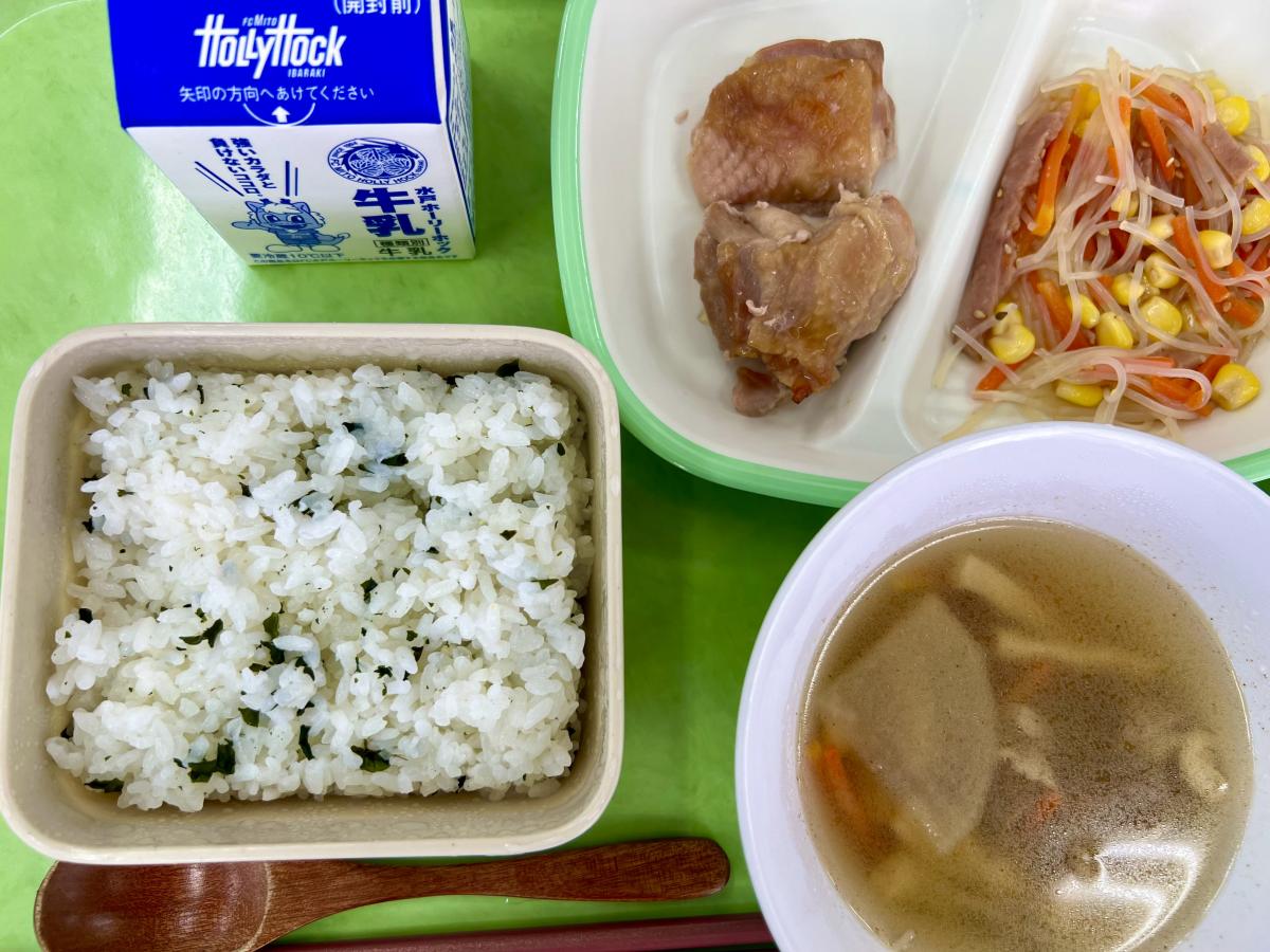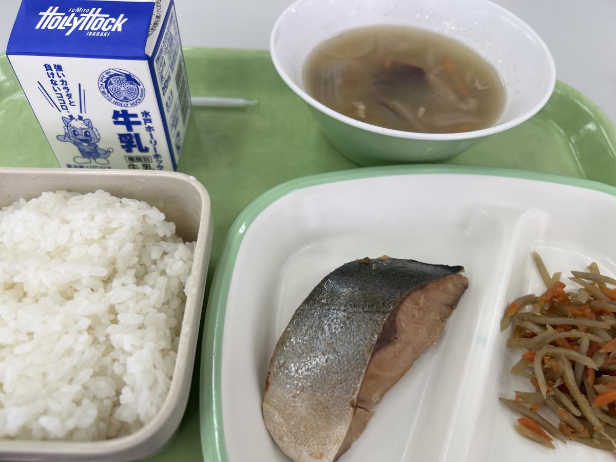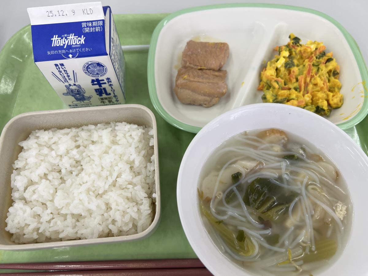 今日の給食は、ぶりの生姜焼き、さつまいも汁、きんぴらごぼうなど、体を温める食材が多く使われたメニューでした。