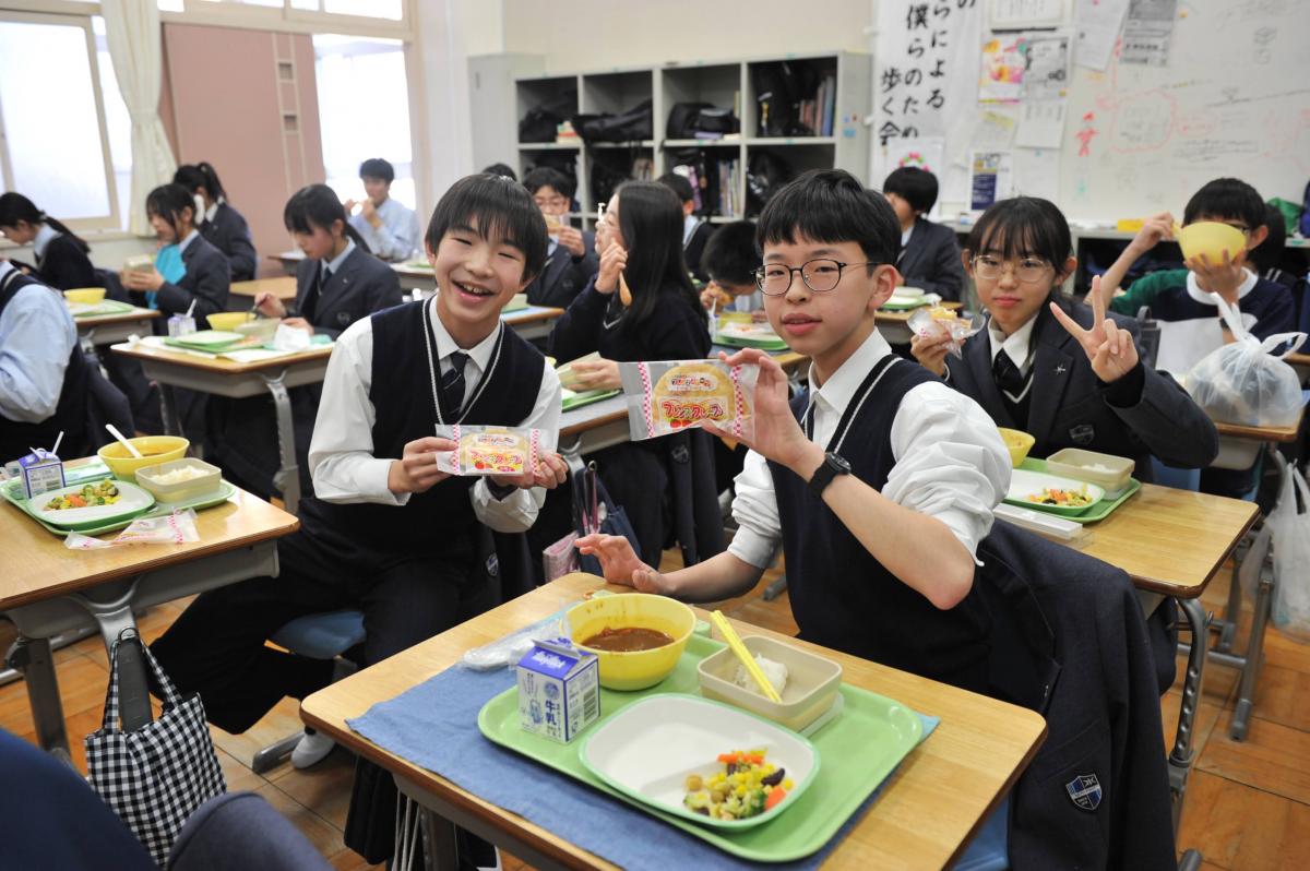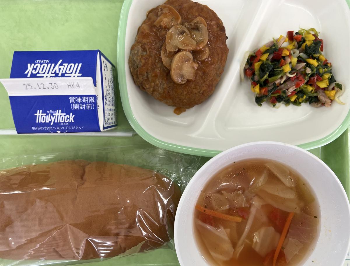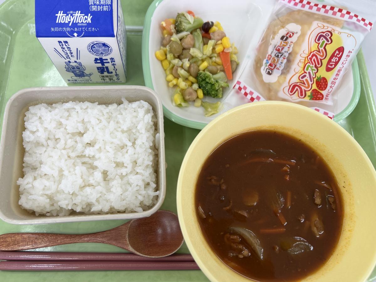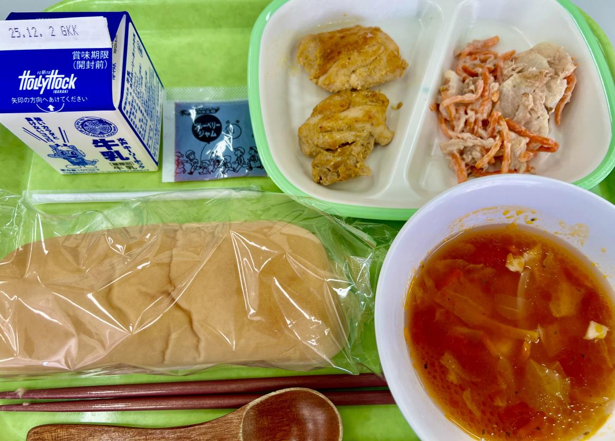 今日の給食メニューは、クリスマスデザート(いちごクレープ)付きで、生徒たちに大変好評でした。