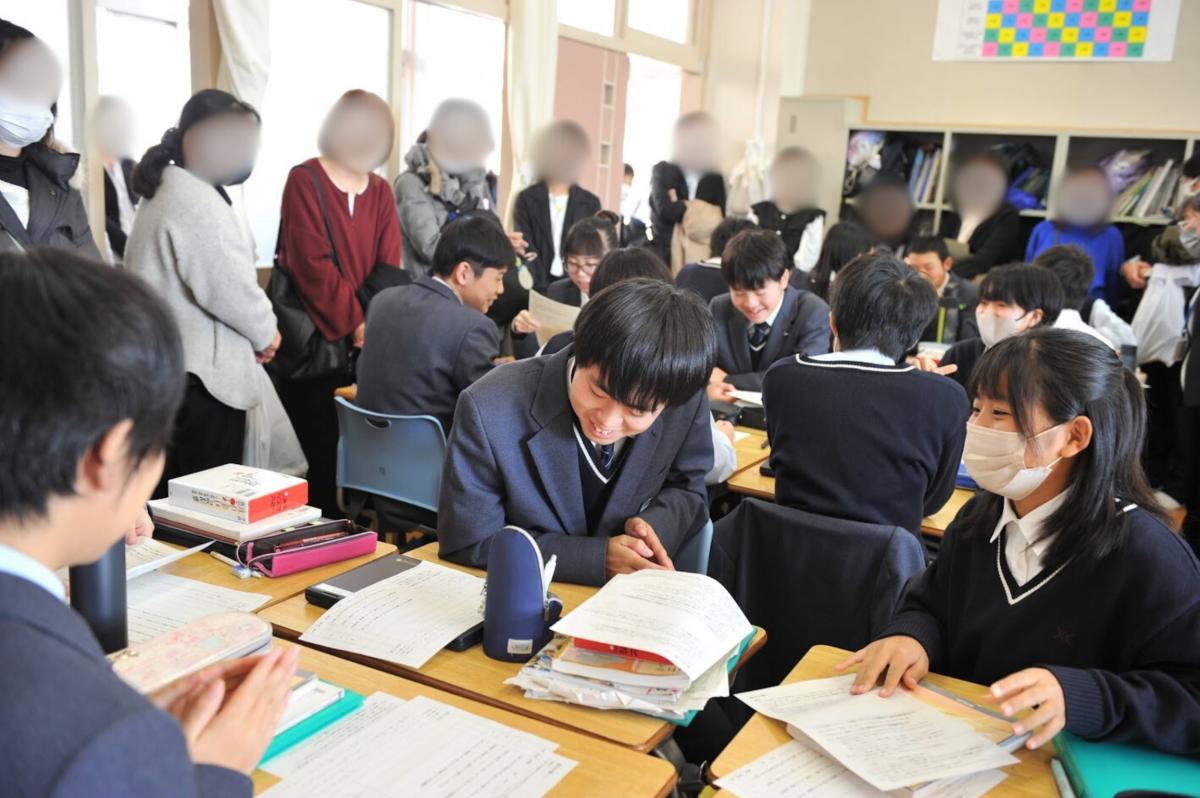 次に、社会課題について授業参観を利用して、保護者の方々に取り上げた社会課題に対してインタビューをさせていただきました。保護者の方々には、非常に熱心に答えていただいたり教えていただいたりしたことで、生徒たちは多くの学びを得たようです。それを踏まえて、社会課題に対する自分の考えをさらに検討した上で、新聞社へ投書しました。
