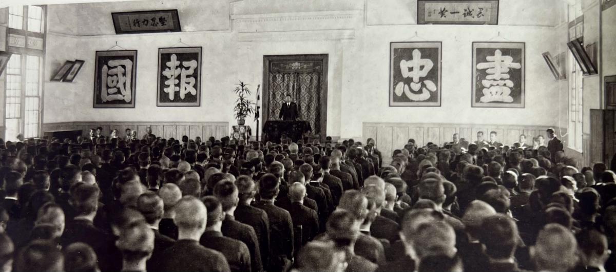 当時の体育館(講堂)の写真。校是よりも大きく「盡忠報國」とある。
