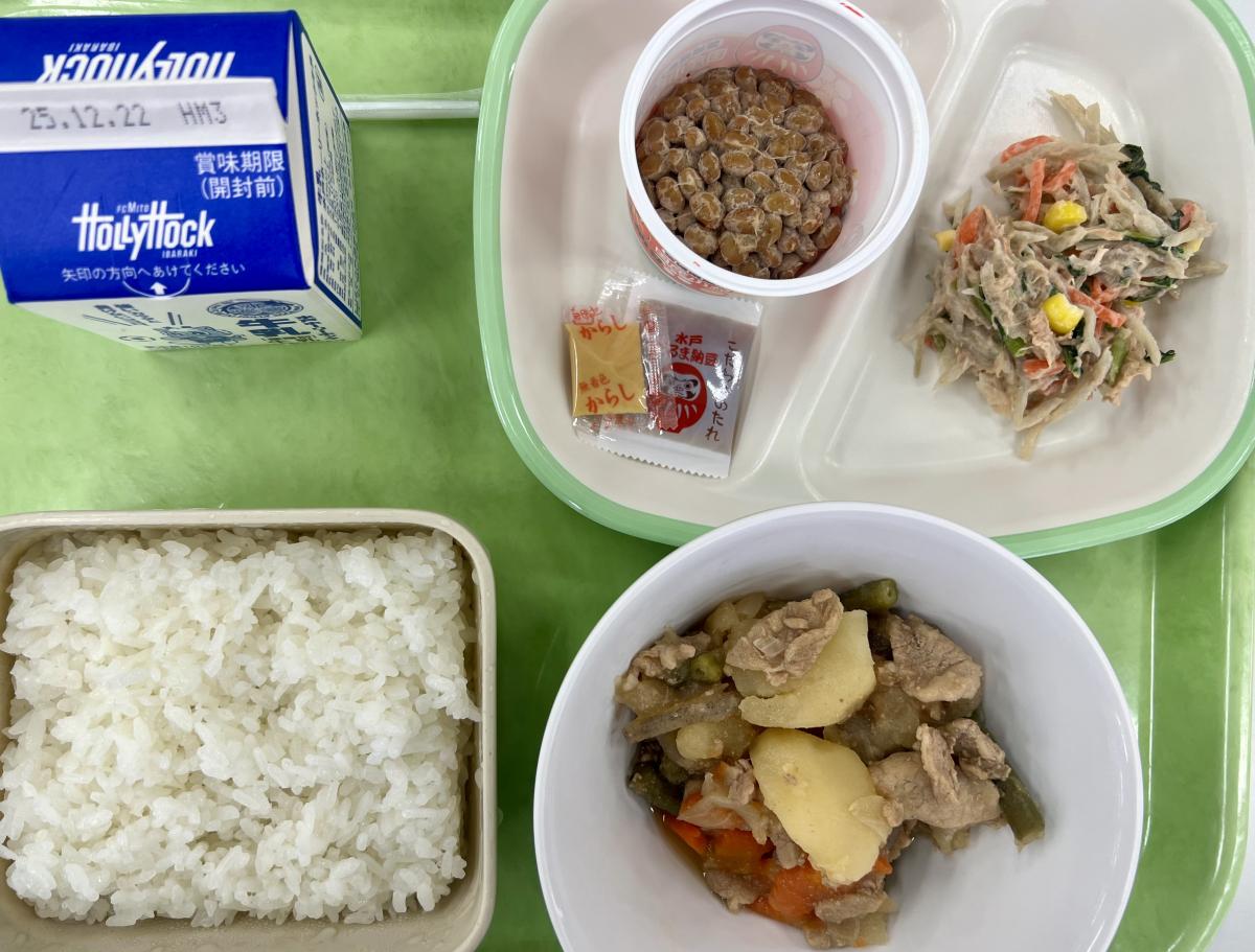 今日の給食には、納豆が出ました。漱石には「初雪や小路へ入る納豆売」など、納豆を詠んだ句もあります。秋冬に収穫された大豆を仕込んで作っていたことなどから、納豆は冬の季語とされています。
