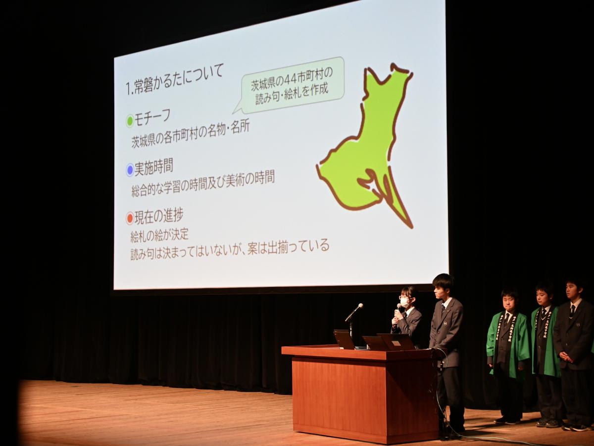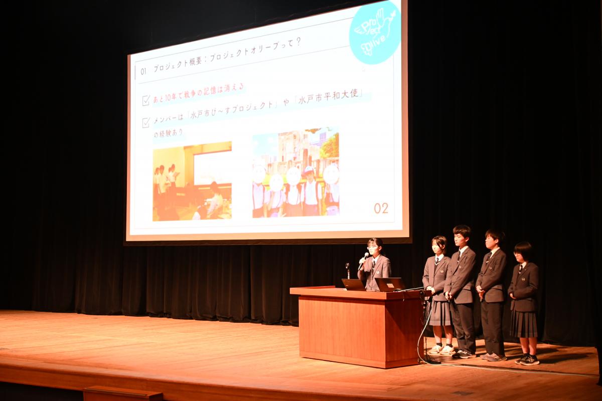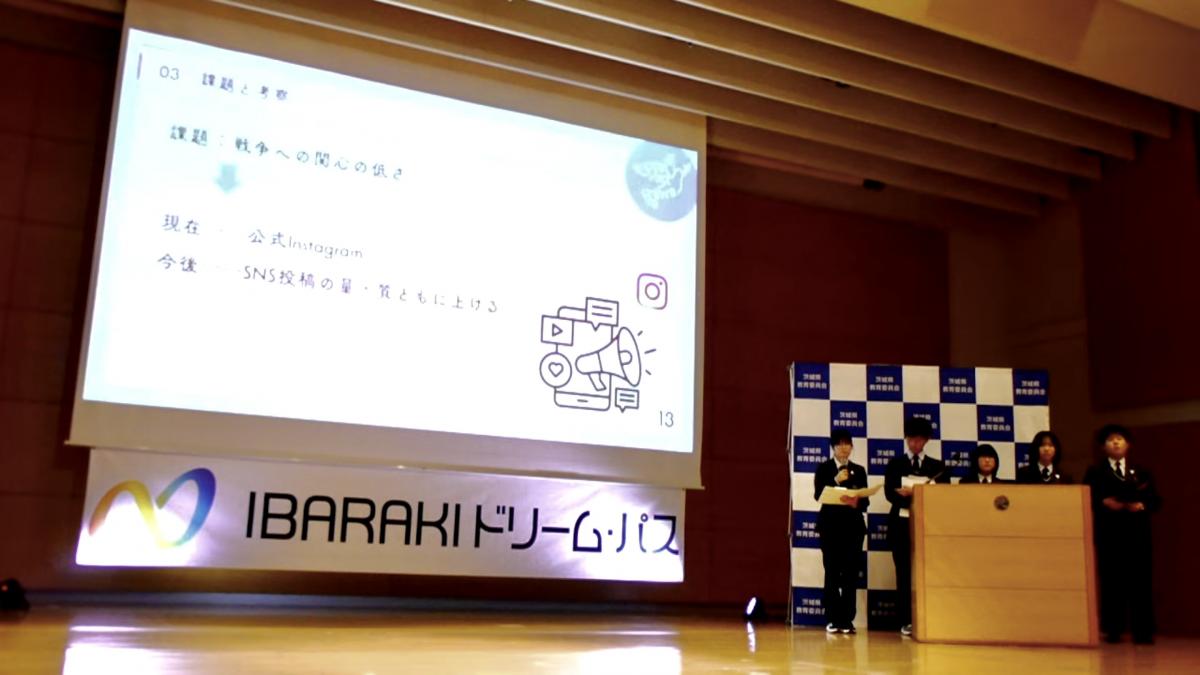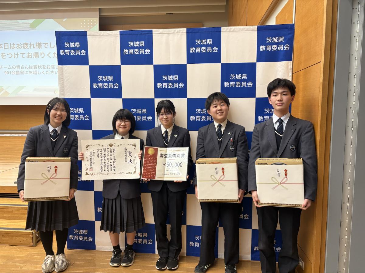 昨日、茨城県庁にてIBARAKIドリームパスAWARD(プレゼンテーション大会)が開催され、本校からは3年生5名から成る「プロジェクトオリーブ」が出場しました。出場15チームのうち、中学生は本校のみで、残りは全て高校生のチームでした。生徒たちは、戦争の記憶を継承し平和の実現につなげる活動を堂々と発表し、審査員特別賞を受賞しました。