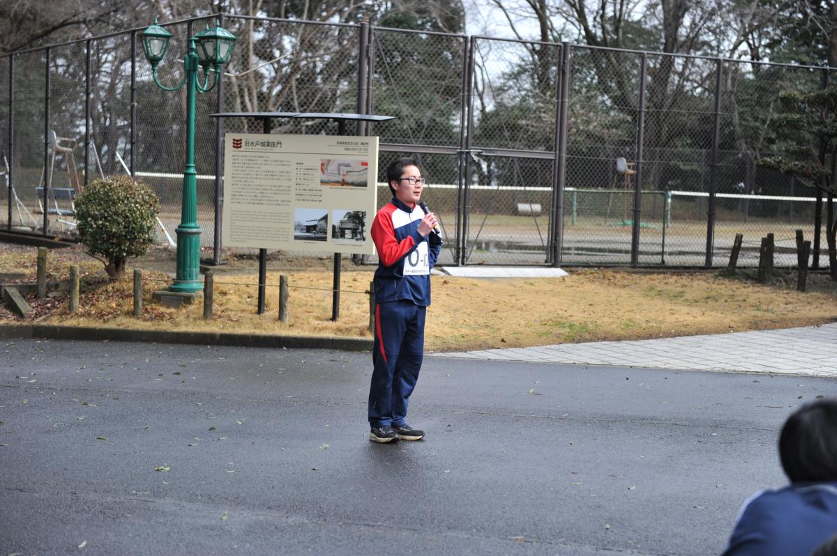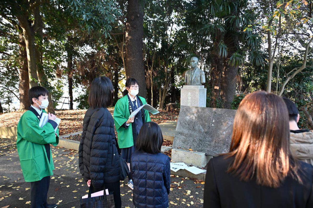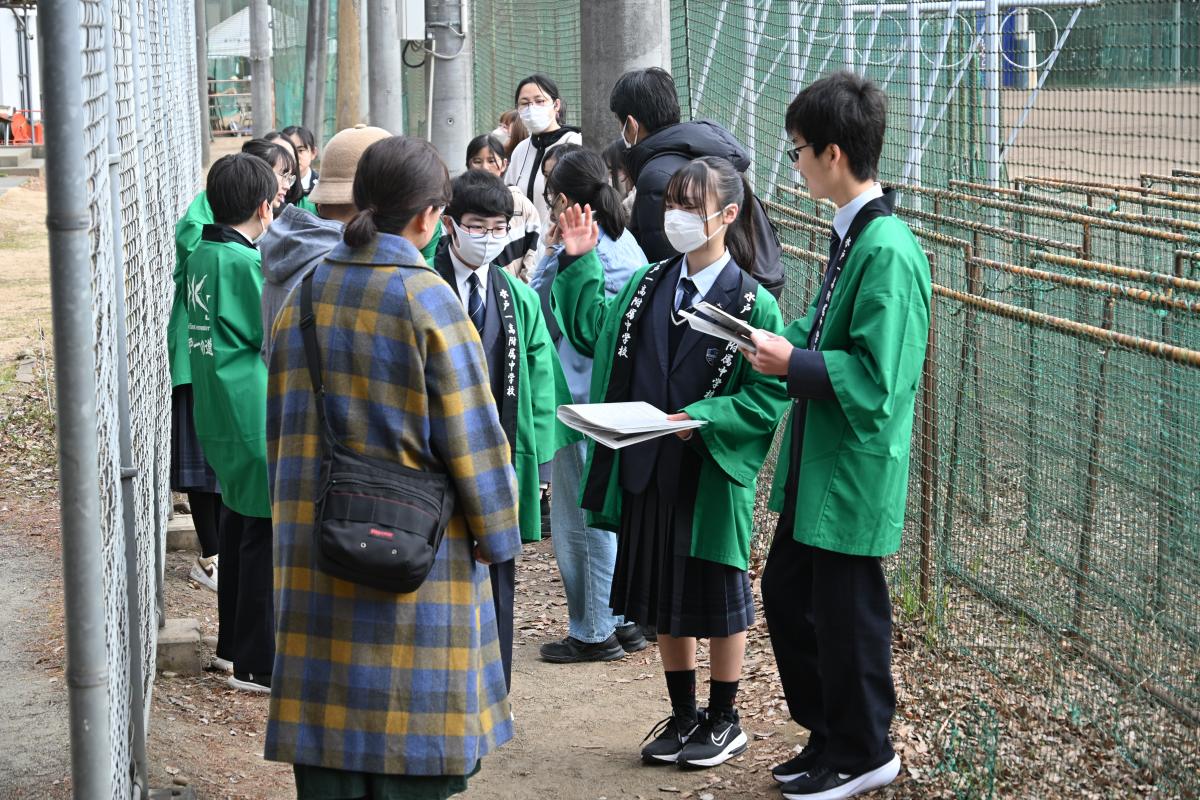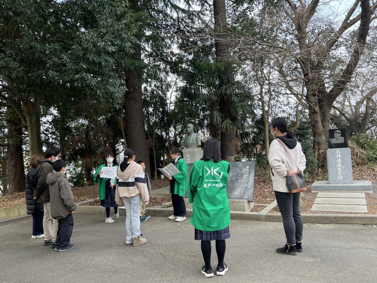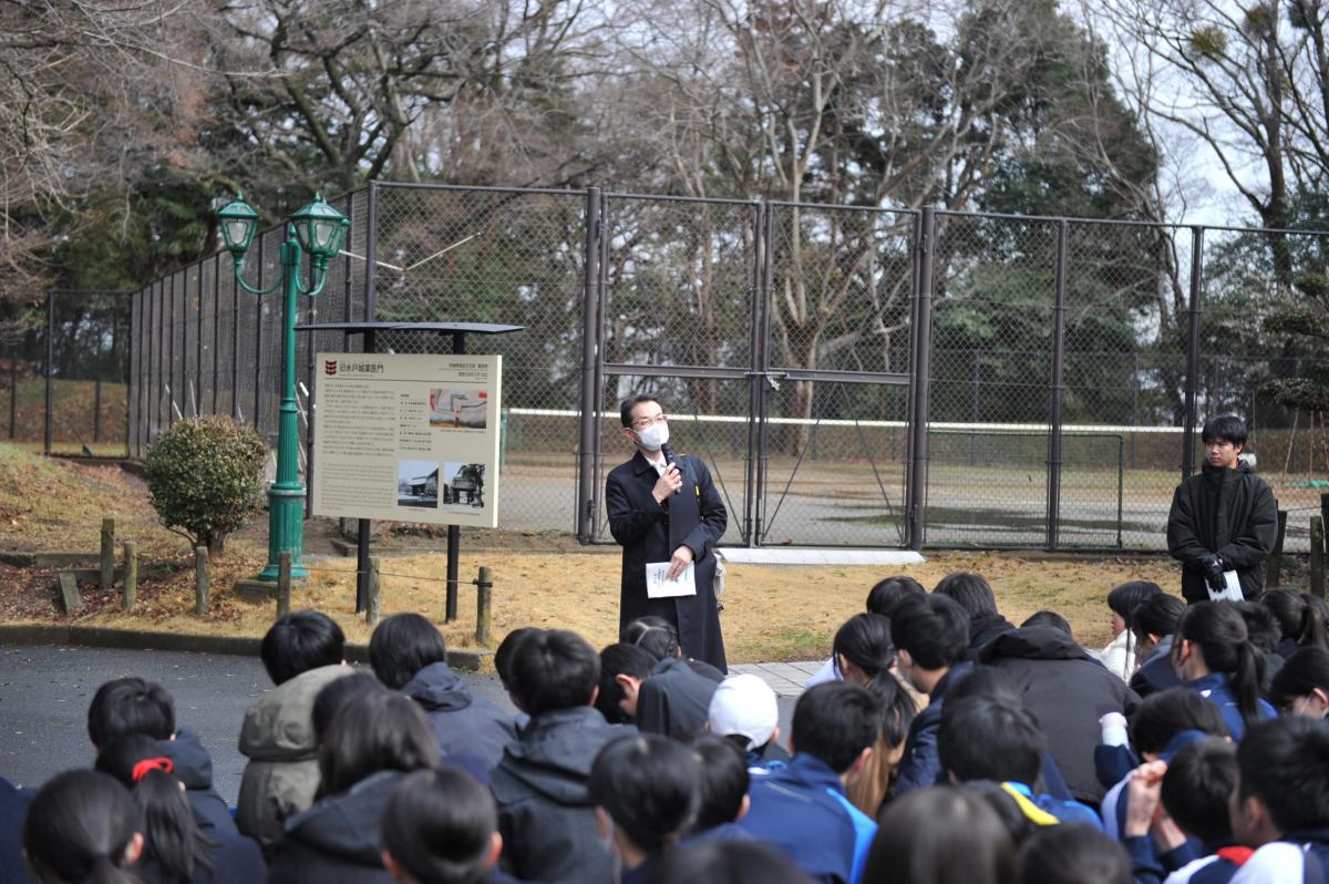 校内ガイドツアー「水戸一の道」で穂洲先生を紹介する生徒