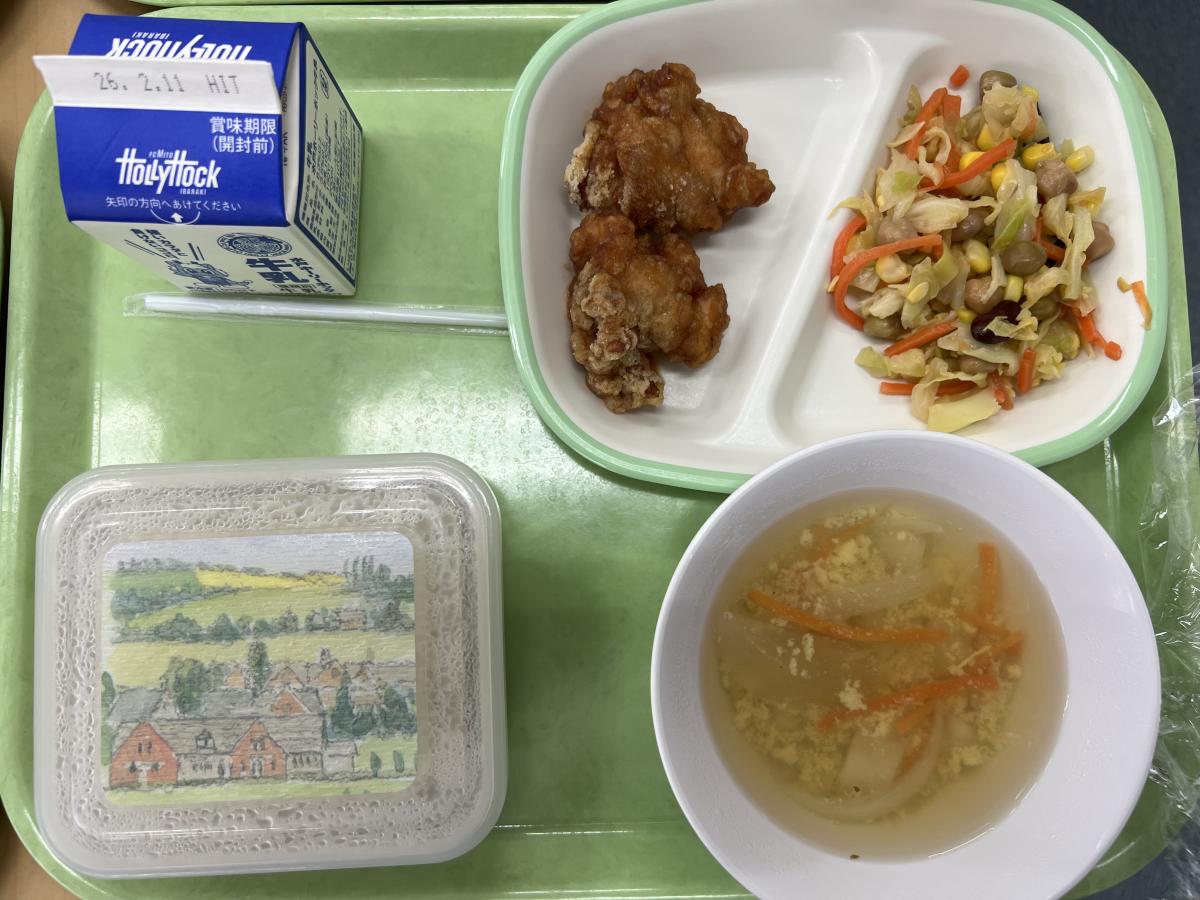 なお、今日の給食は、世界の味めぐりシリーズの一環として、アメリカを取り上げました。バッファローチキンなどを美味しくいただきました。