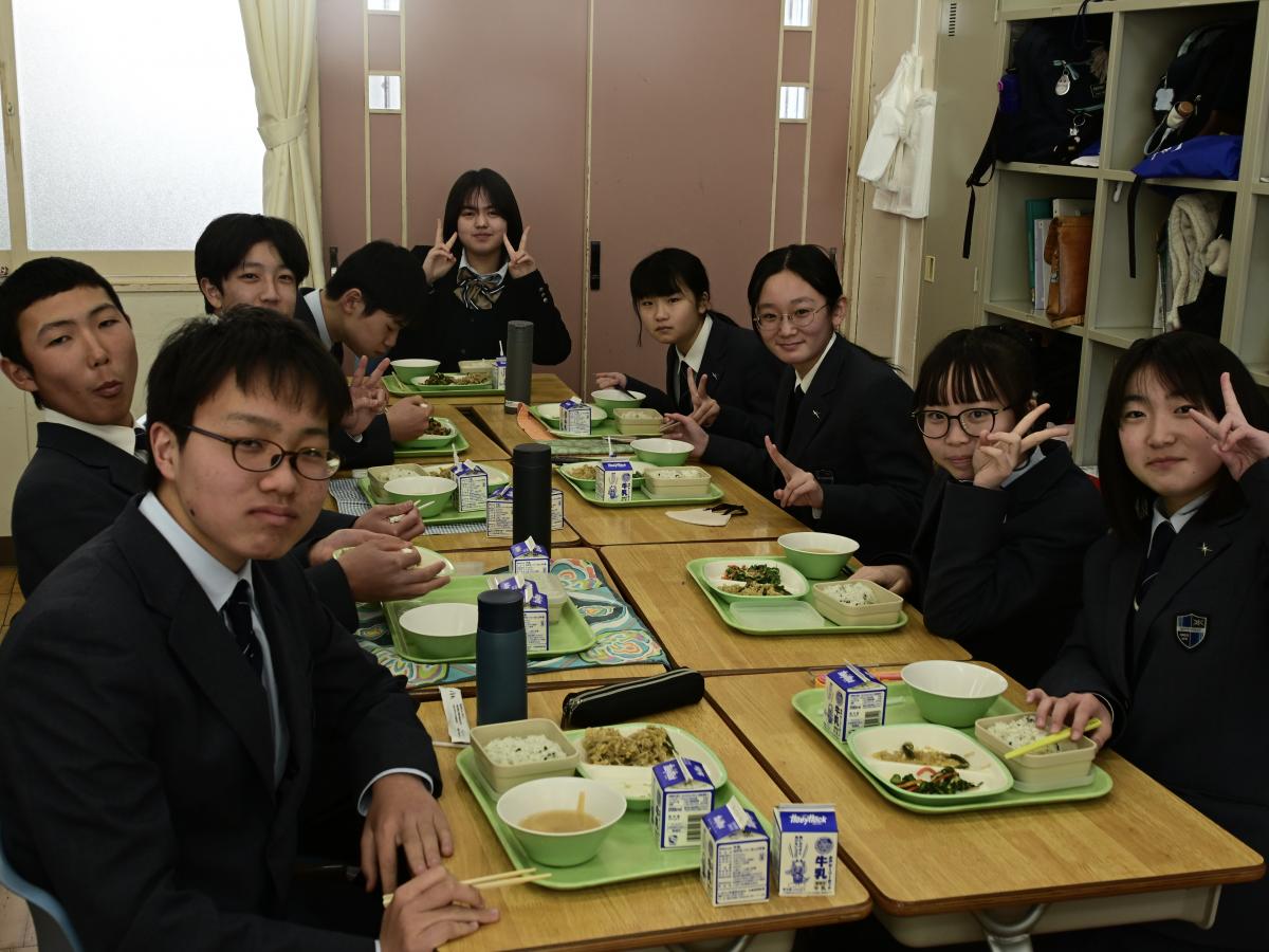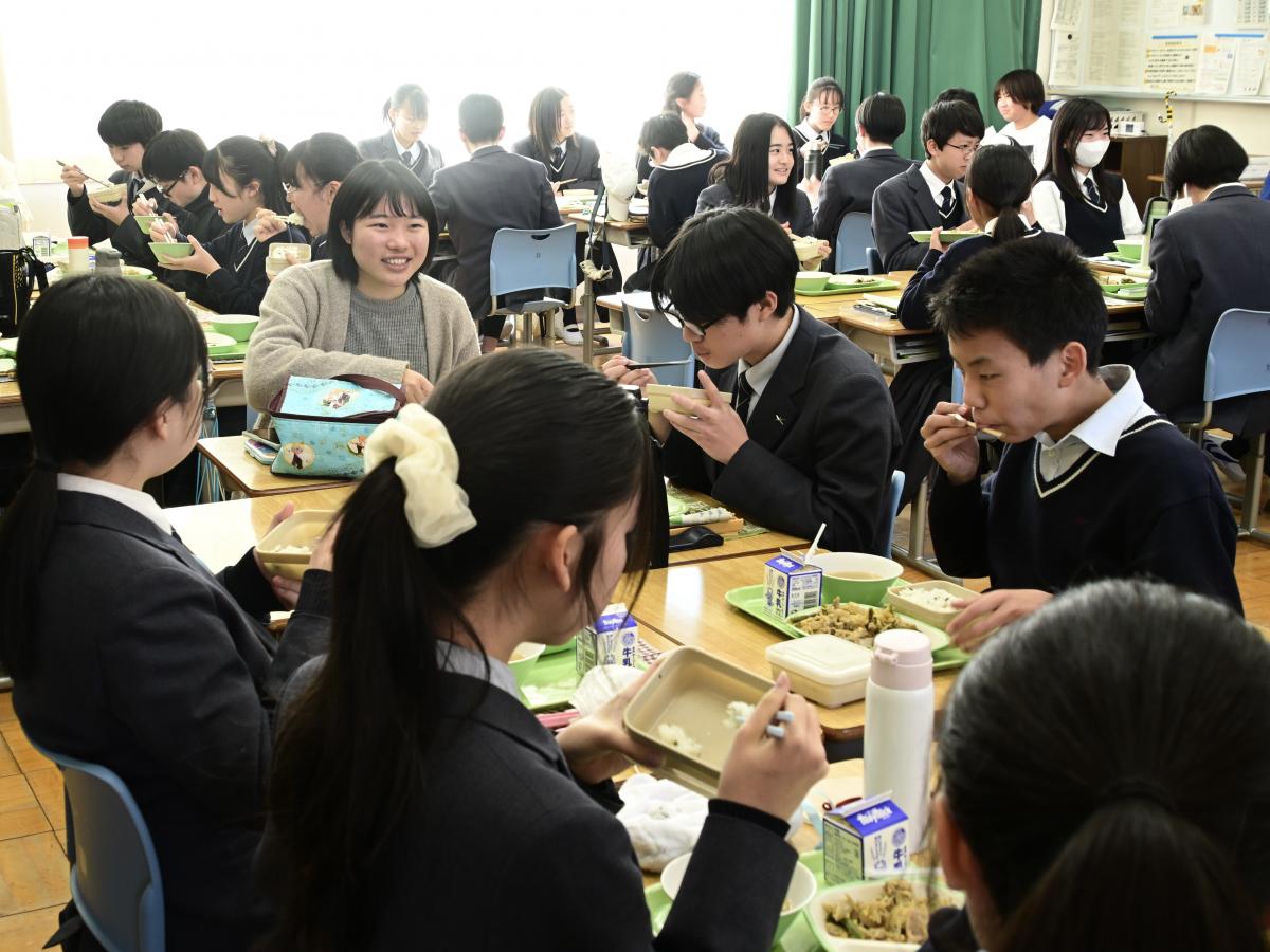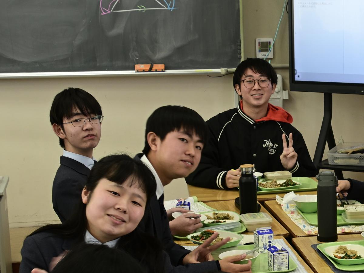 本校では、卒業生の水戸一高生との交流給食を実施しています。今日は、高1・高2の先輩を中2が囲む形で、楽しく昼食をいただきました。