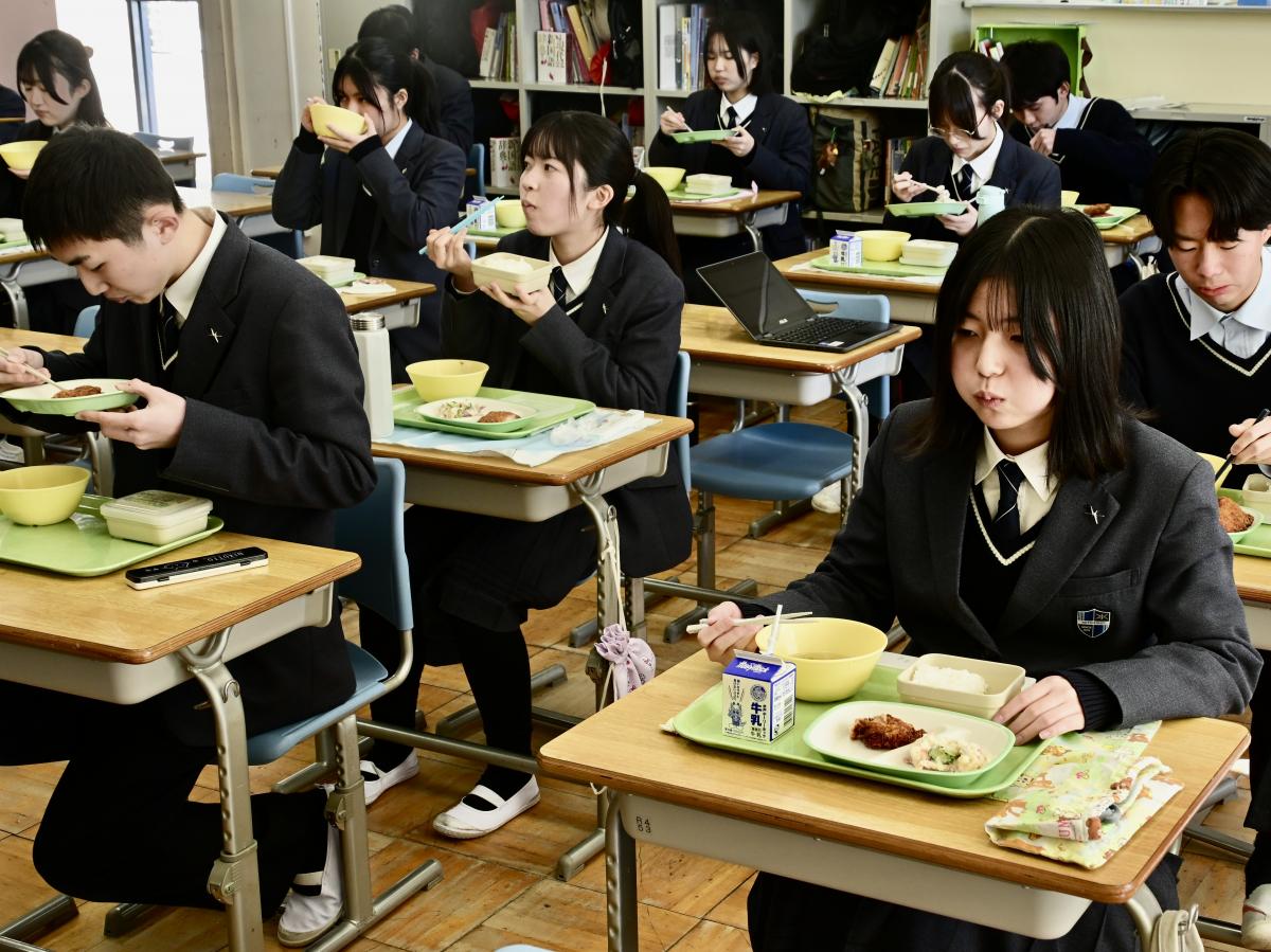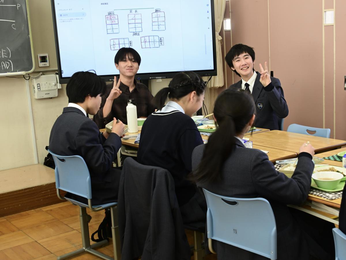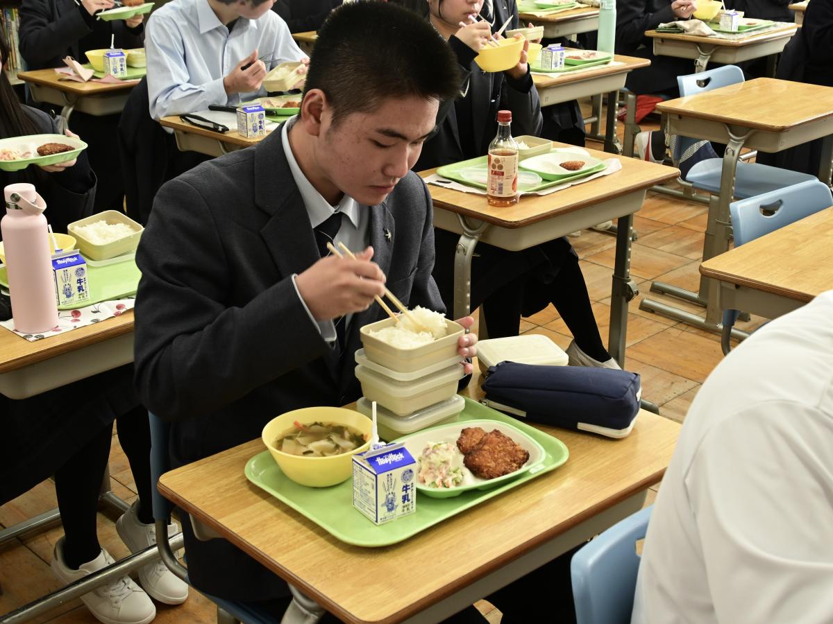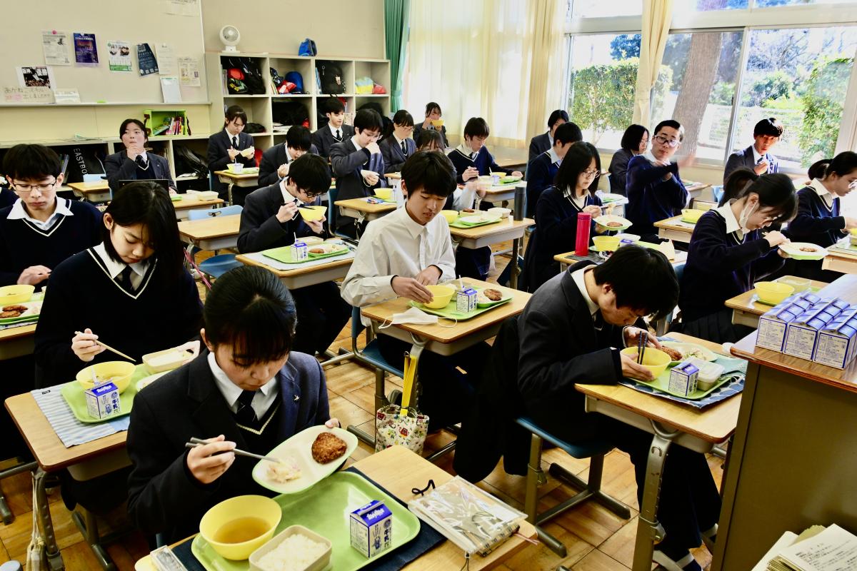 本校では、卒業生の水戸一高生との交流給食を実施しています。今日は、高1・高2の先輩を中2が囲む形で、楽しく昼食をいただきました。