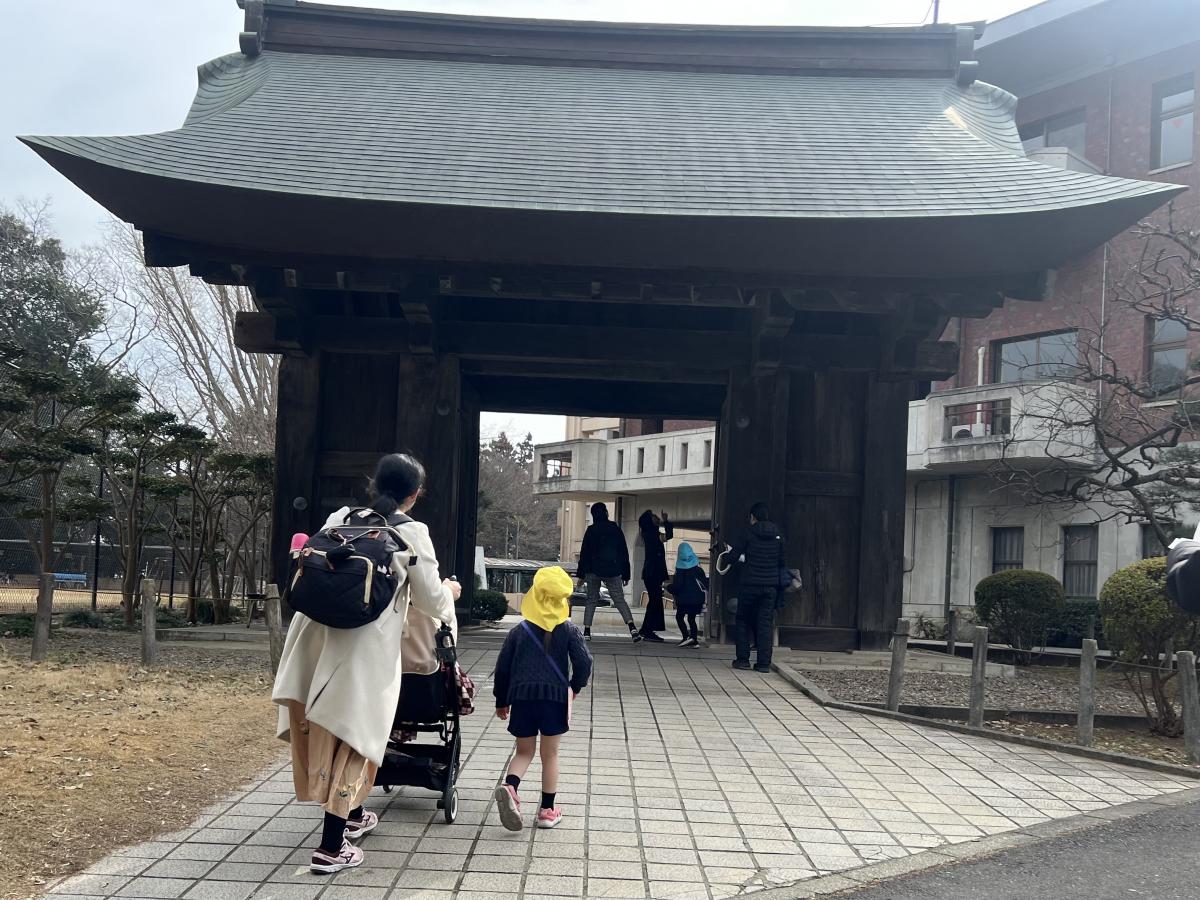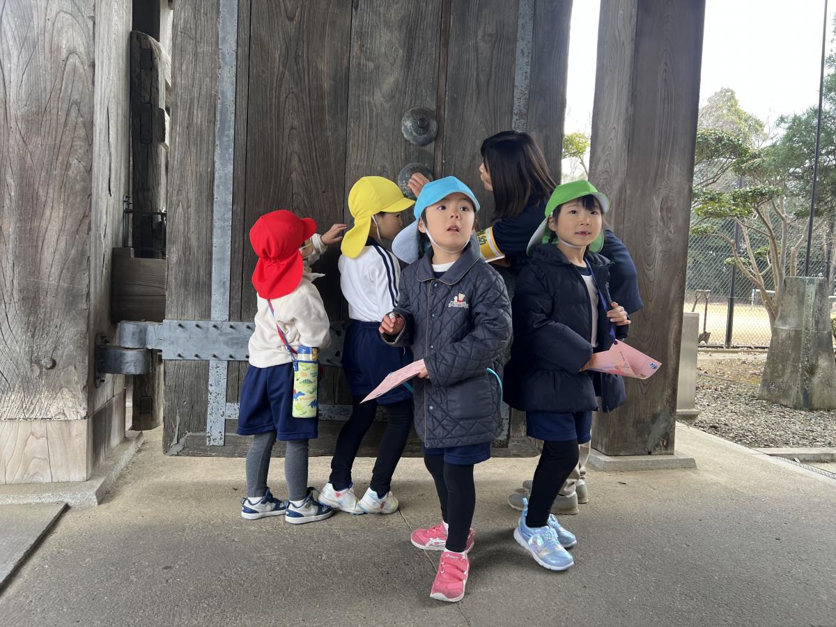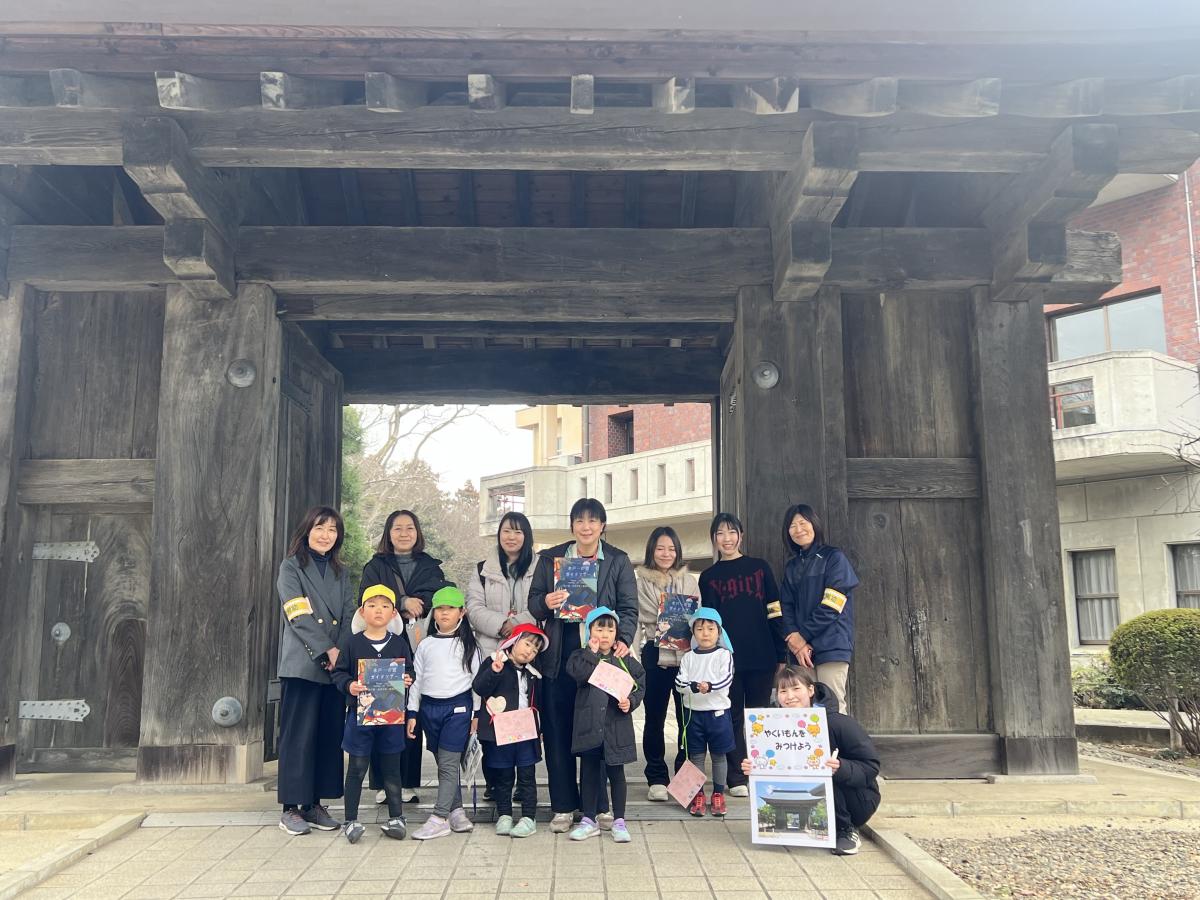 小春日和の暖かさとなった今日、茨城大学教育学部附属幼稚園の皆さんが、親子ウォークラリー(みとがくさんぽ)で来校されました。園児たちは、「高校生はテスト中だから、静かに行動しようね」との園長先生の指導をきちんと守りつつ、「400歳」の薬医門を興味津々で見学していました。