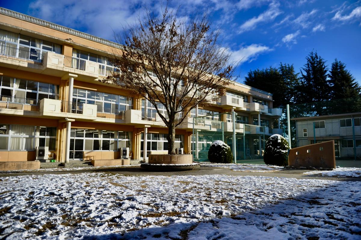 朝、学校内外はうっすら雪化粧していました。
