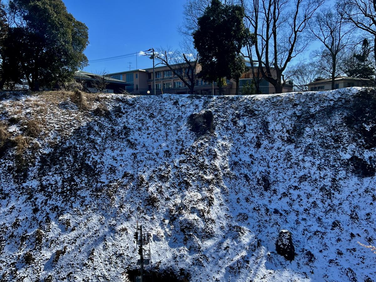 現在、冬季五輪が開催中ですが、スノーボードやスキーが実施される「ハーフパイプ」の壁の高さは約22フィート(約6.7m)。そこから7m以上跳ぶ選手もいるそうなので、底からの高さは14mにも達します。一方、本校前の土塁の高さは最大22m。日本最大級の水戸城本丸堀の規模がわかりますね。