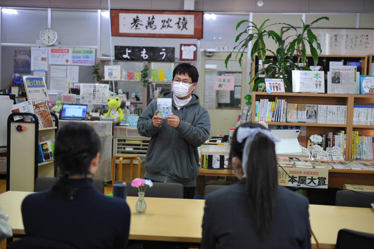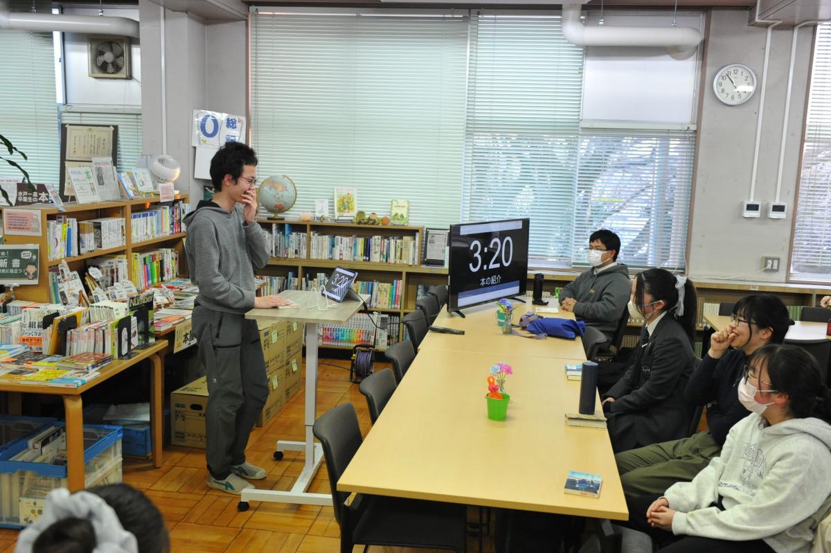 先週金曜日(2/13)の放課後、図書館にて中高合同のビブリオバトルが開催されました。本好きな生徒5名がおすすめ本の魅力を熱弁。結果、『彗星を追うヴァンパイア』(河野裕著、KADOKAWA)がチャンプ本に選ばれました。