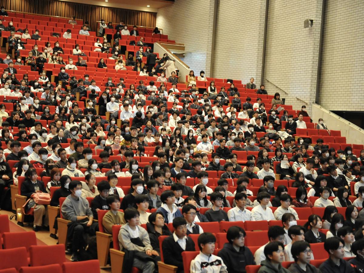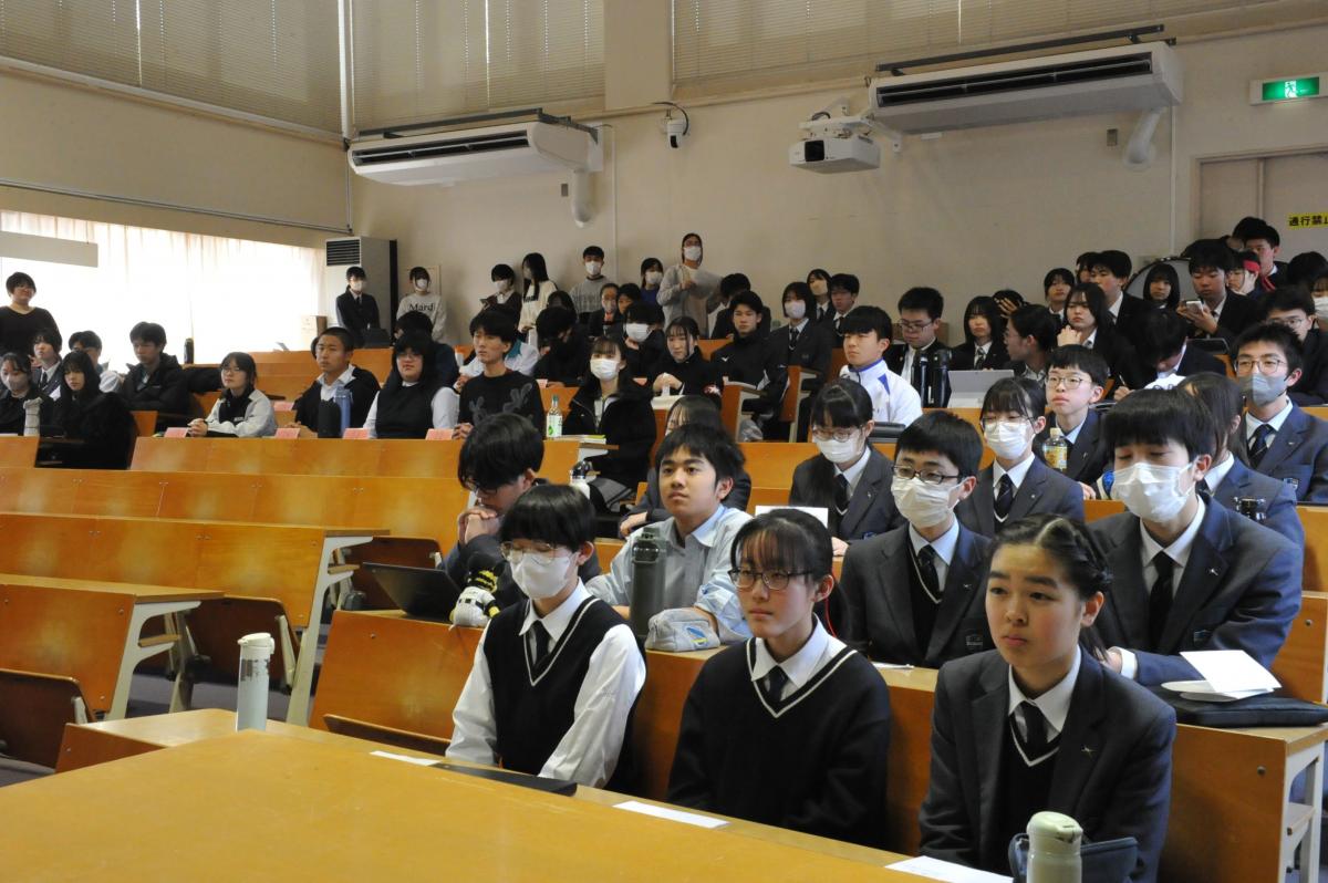 全体での集合後、工学部の大教室で、学部長の加藤泰浩先生からご講演いただきました。ニュースでも大きく取り上げられたマンガンノジュールなど、ご自身の研究のみならず、ノーベル賞候補とも目される、工学部の優れた先生方の最先端の研究もたくさんご紹介いただき、生徒たちは大いに知的好奇心を高めることができました。さらに、受験に向けた勉強法を含め、多くの質問に懇切丁寧に答えてくださいました。