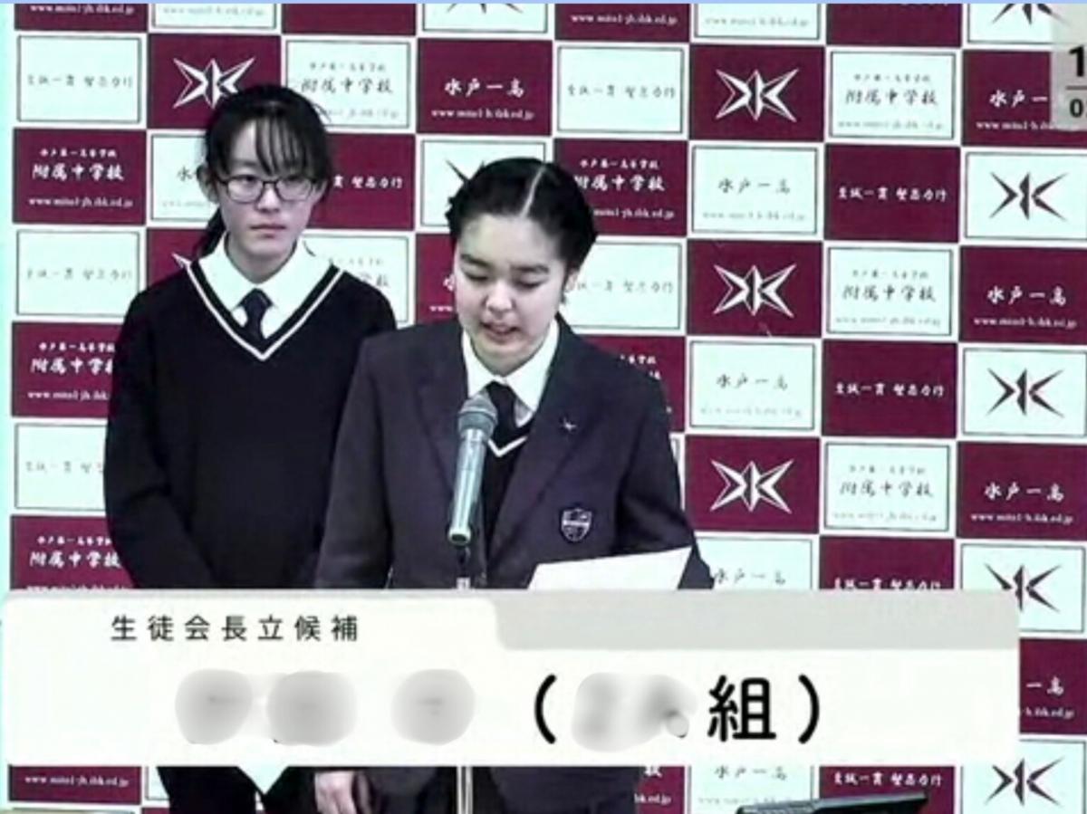 演説会では、生徒会役員選挙への立候補者(中学が会長1名、副会長6名、高校が会長3名、副会長4名)及び責任者がそれぞれの公約を熱く訴えました。中継映像には、選挙番組ふうのテロップが入れられました。