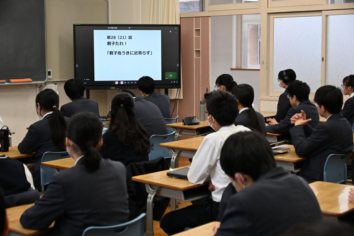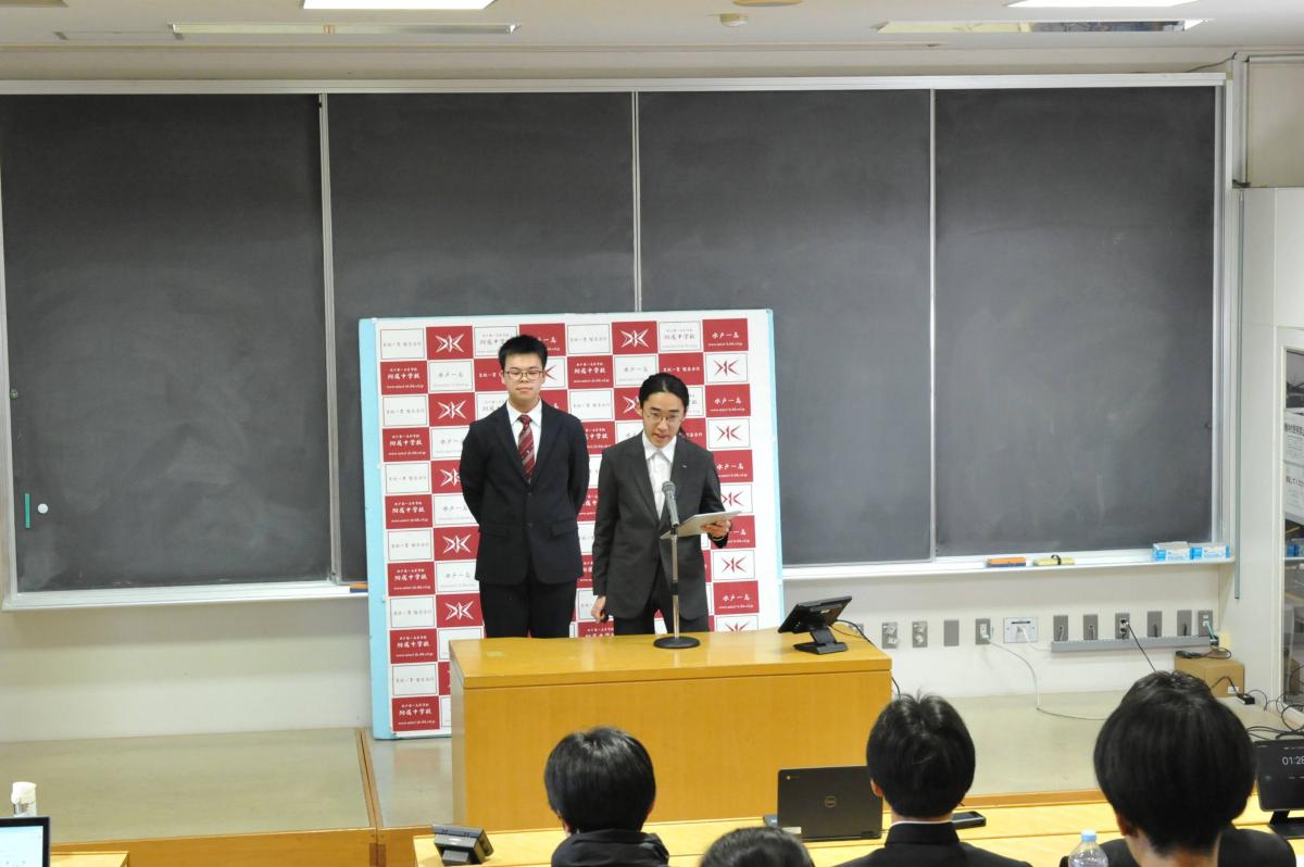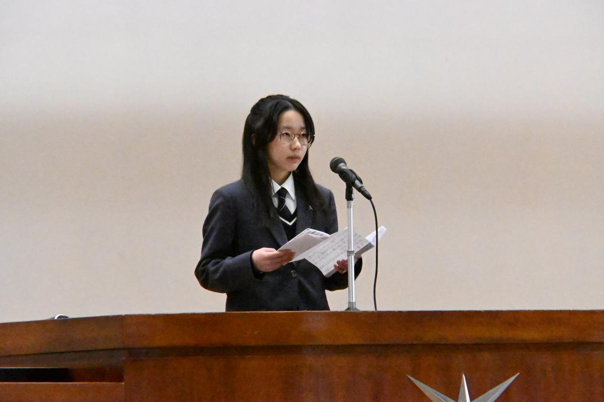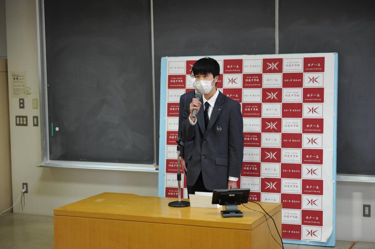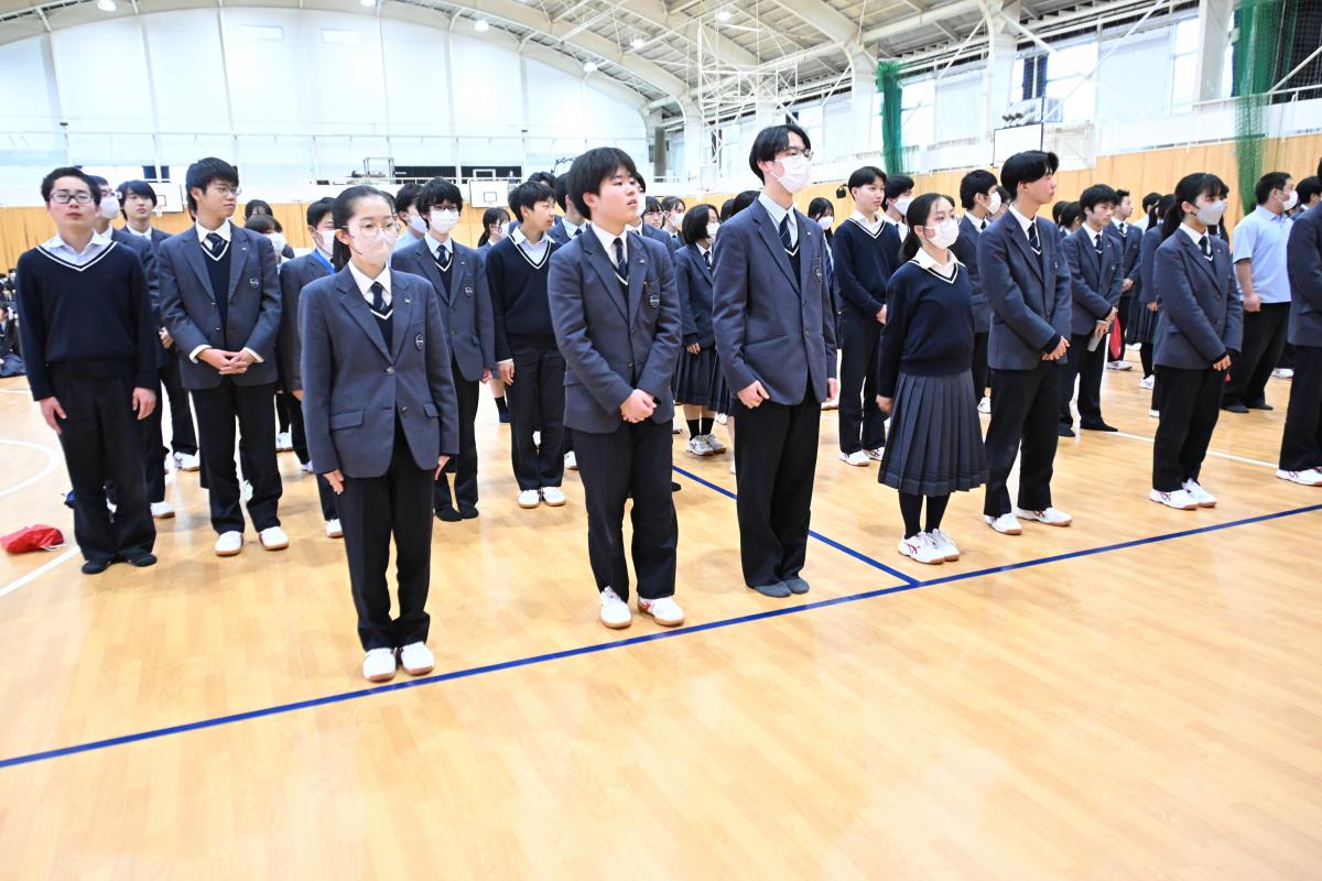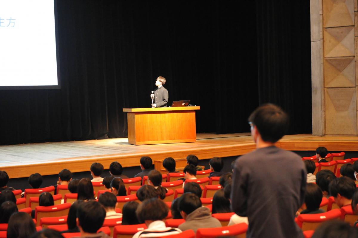 また、卒業式実行委員会から式歌(藤井風「旅路」)の決定、学苑祭検討委員会からキャッチコピー(創造は、どこまでも高く。)の決定、自由討論検討委員会から自由討論の休止と改革、知道編集委員会から原稿募集について連絡があり、さらに中高生徒会からの活動報告、歩く会検討委員会委員長からの挨拶等がありました。生徒主導で、様々な新しい企画が動き出しており、新年へと期待が膨らみます。