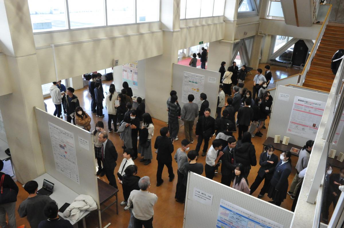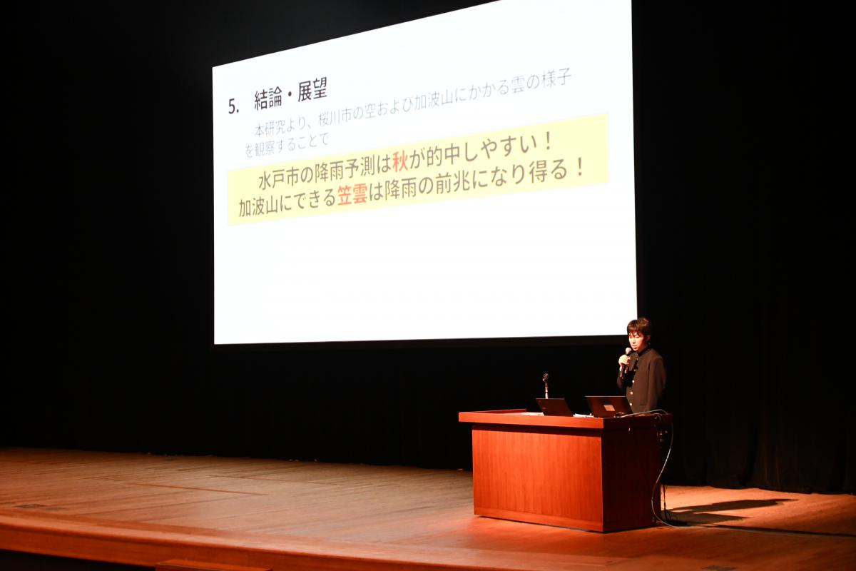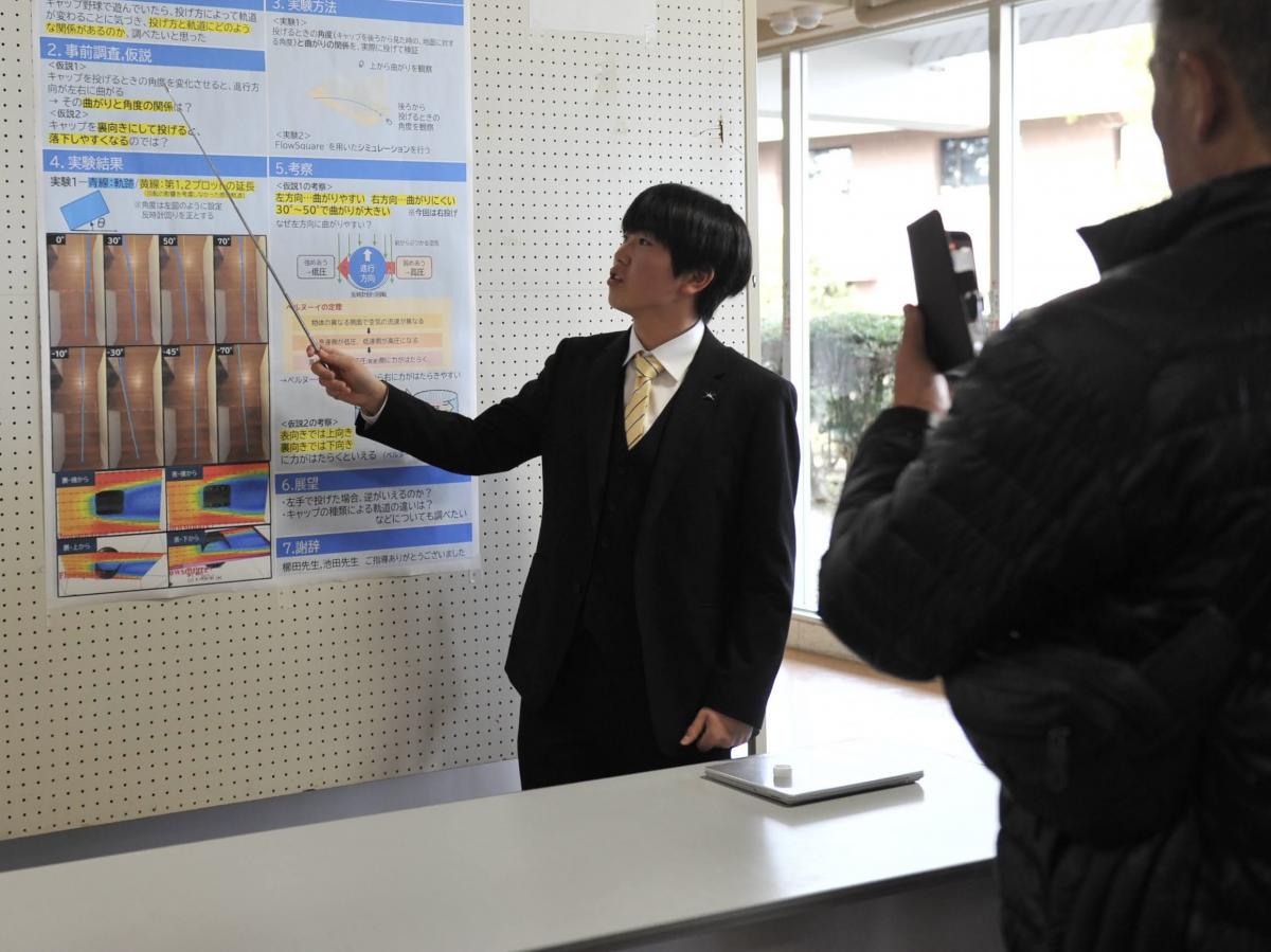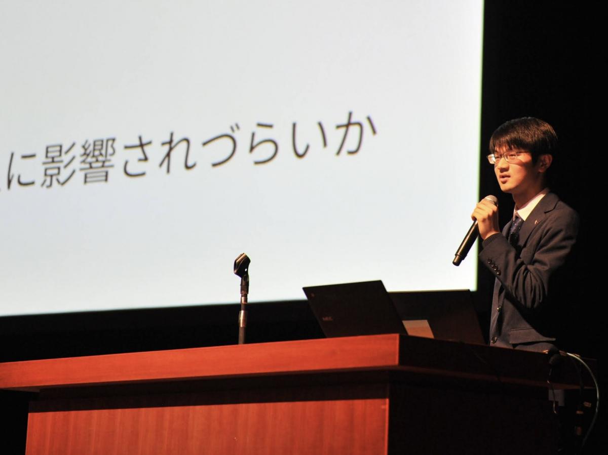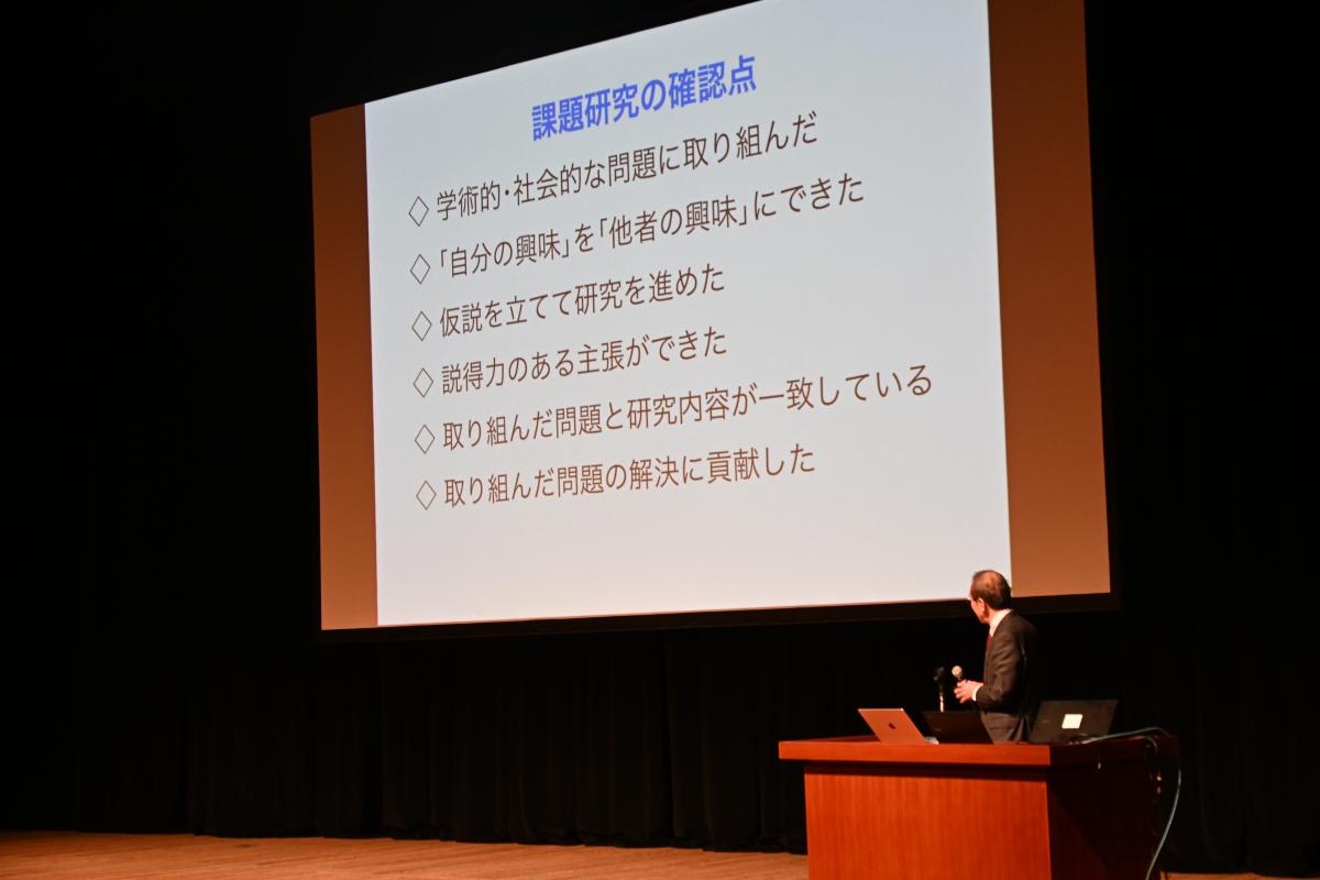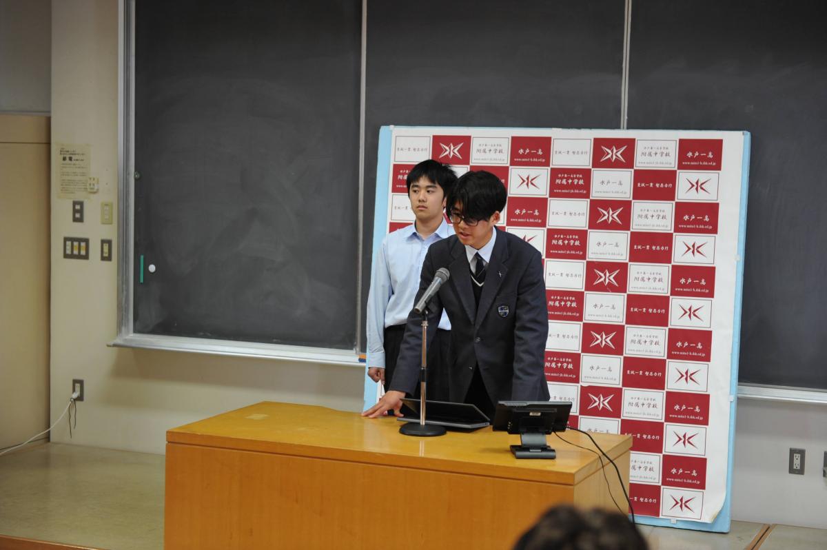 高2の探究成果の発表を中心に、中学1・3年の特別発表、校外で活躍したグループの発表を行い、最後、東北大学大学院の酒井聡樹先生より、具体例を交えた詳細な講評をいただきました。発表した生徒はもちろん、多種多様な探究活動に触れた生徒たちにとって、大学進学後も見すえた今後の探究活動に資する、良い機会となりました。
