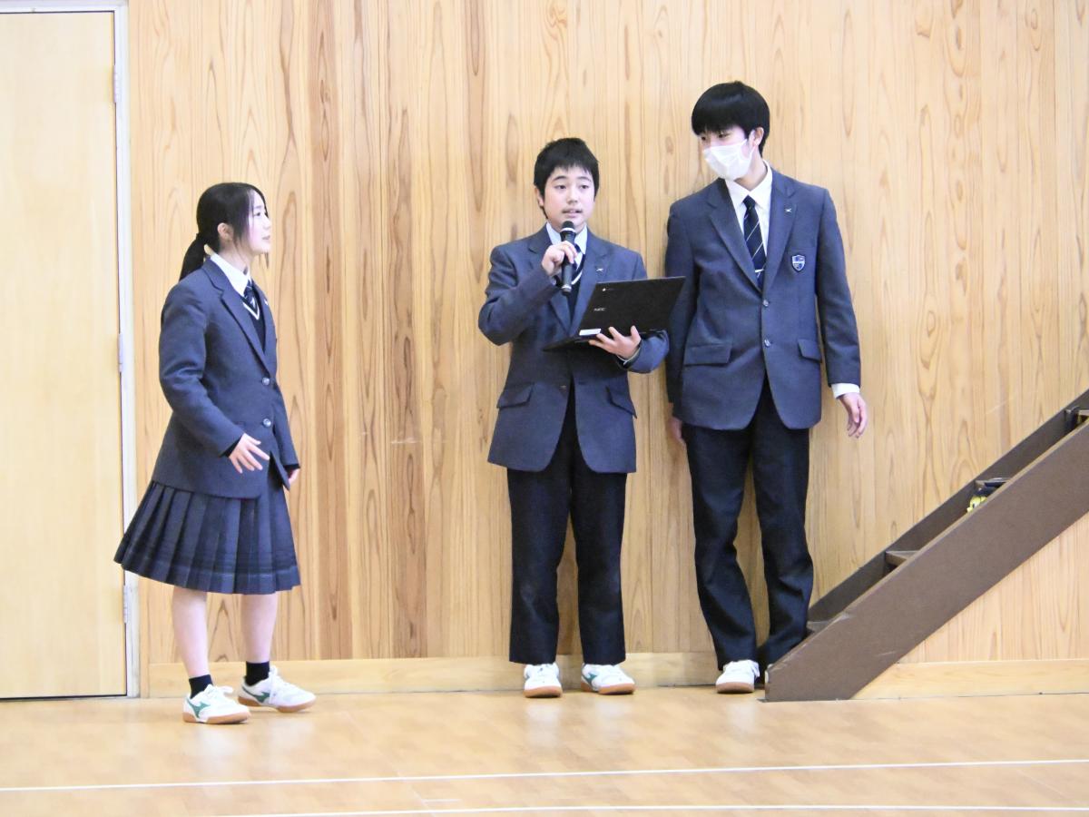 今日は、卒業生を送る会・謝恩会を体育館で開催しました。1・2年生の司会でクイズやレク、ダンス発表などで盛り上がったあと、3年生から先生方へ感謝の言葉が伝えられました。