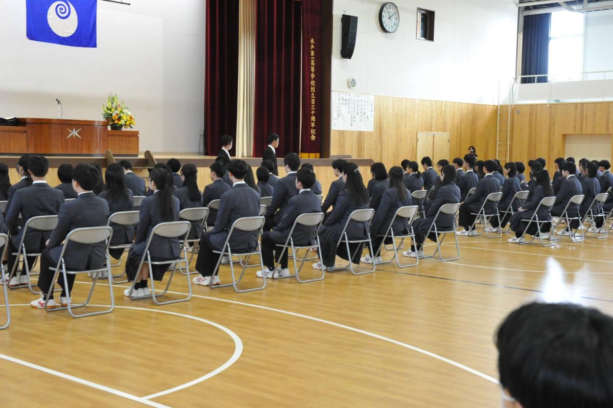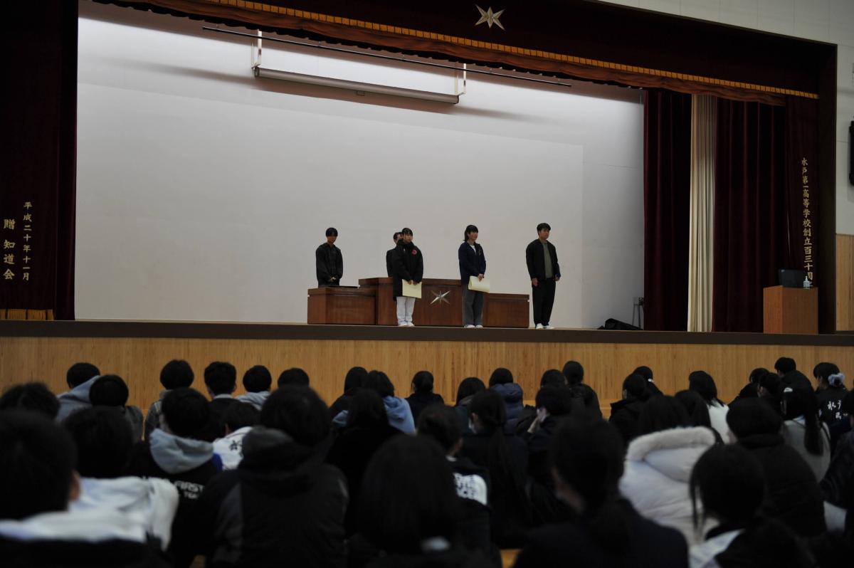 本日午後、定例生徒集会及び生徒会役員選挙立会演説会を、階段教室にホームルーム代表を集め、そこから各教室に中継する形で実施しました。集会では、校歌斉唱、校長講話、表彰(弓道、書道、吹奏楽、放送、ワールドスカラーズカップ、IBARAKIドリームパス、体力つくり)、壮行会(吹奏楽)、委員会連絡(卒業式実行委員会、中学生徒会)がありました。