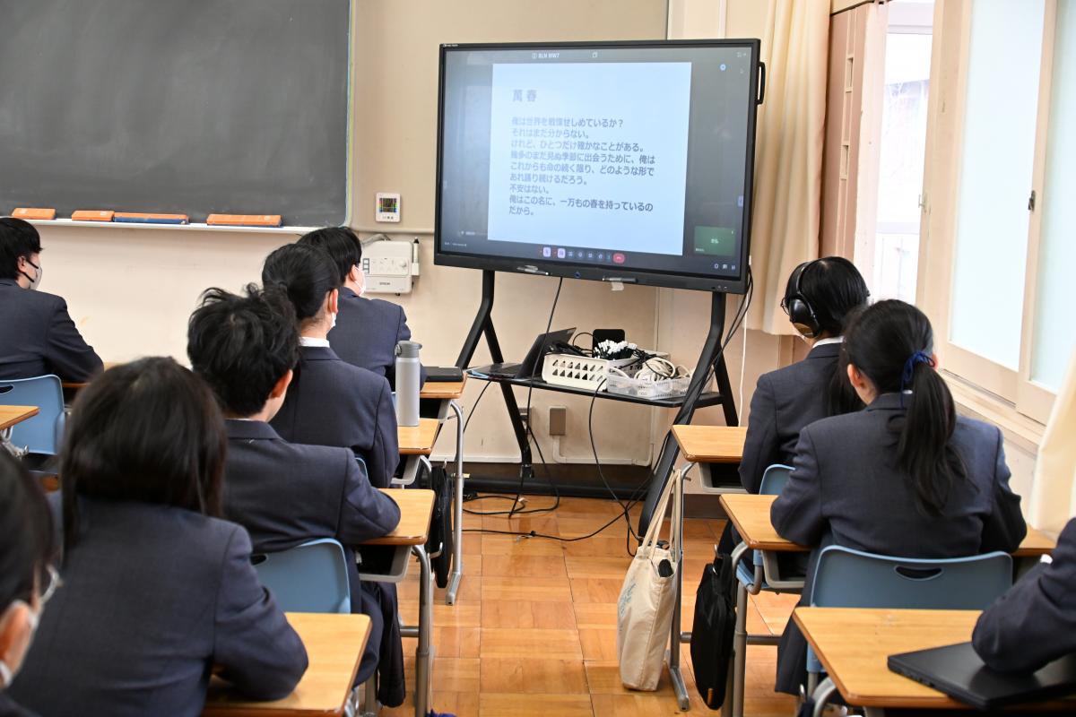 本日、高3にとって最後の定例生徒集会を、階段教室からの中継にて開催しました。校歌斉唱、校長講話のあと行われた自由討論では、高3生が後輩や同期、先生たちに熱いメッセージを送りました。
